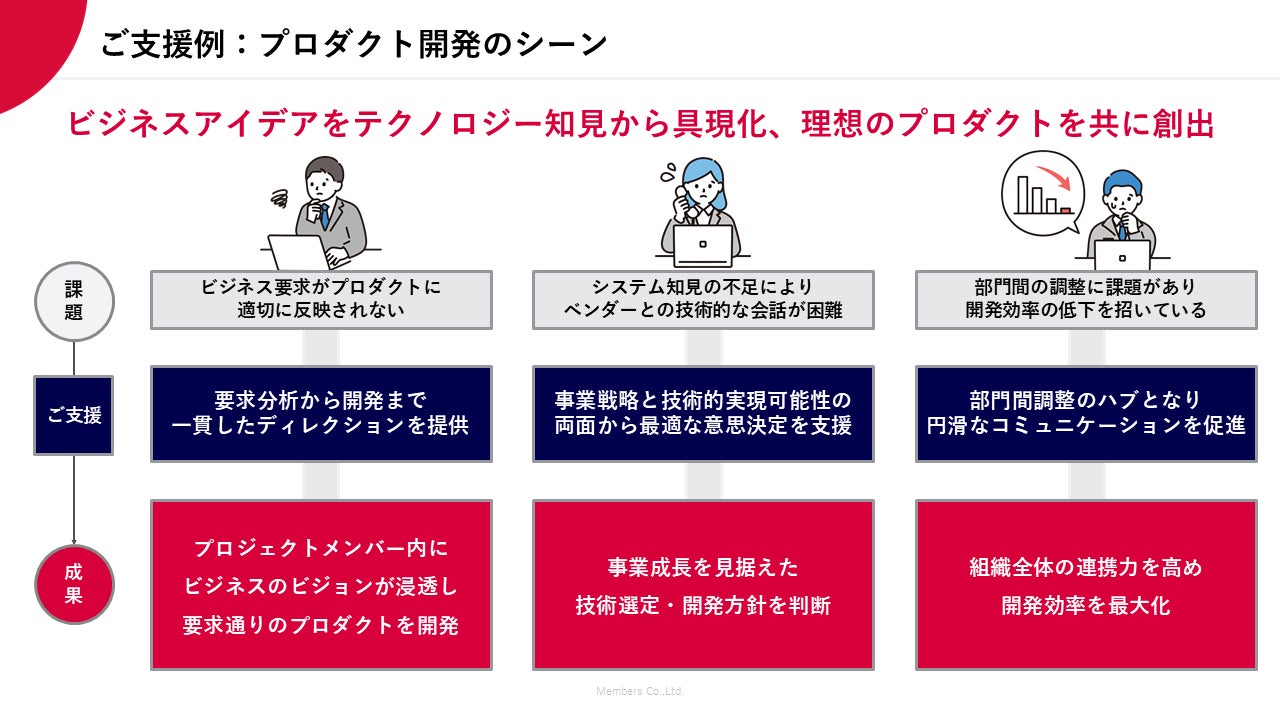 メンバーズではこれまで、企業の高度な専門性を要するシステム開発や、外部パートナーを含むグローバルチームのビジネス部門とシステム部門の横断プロジェクト、システム企画部門への伴走を通じたスキルトランスファーなどを支援してきました。