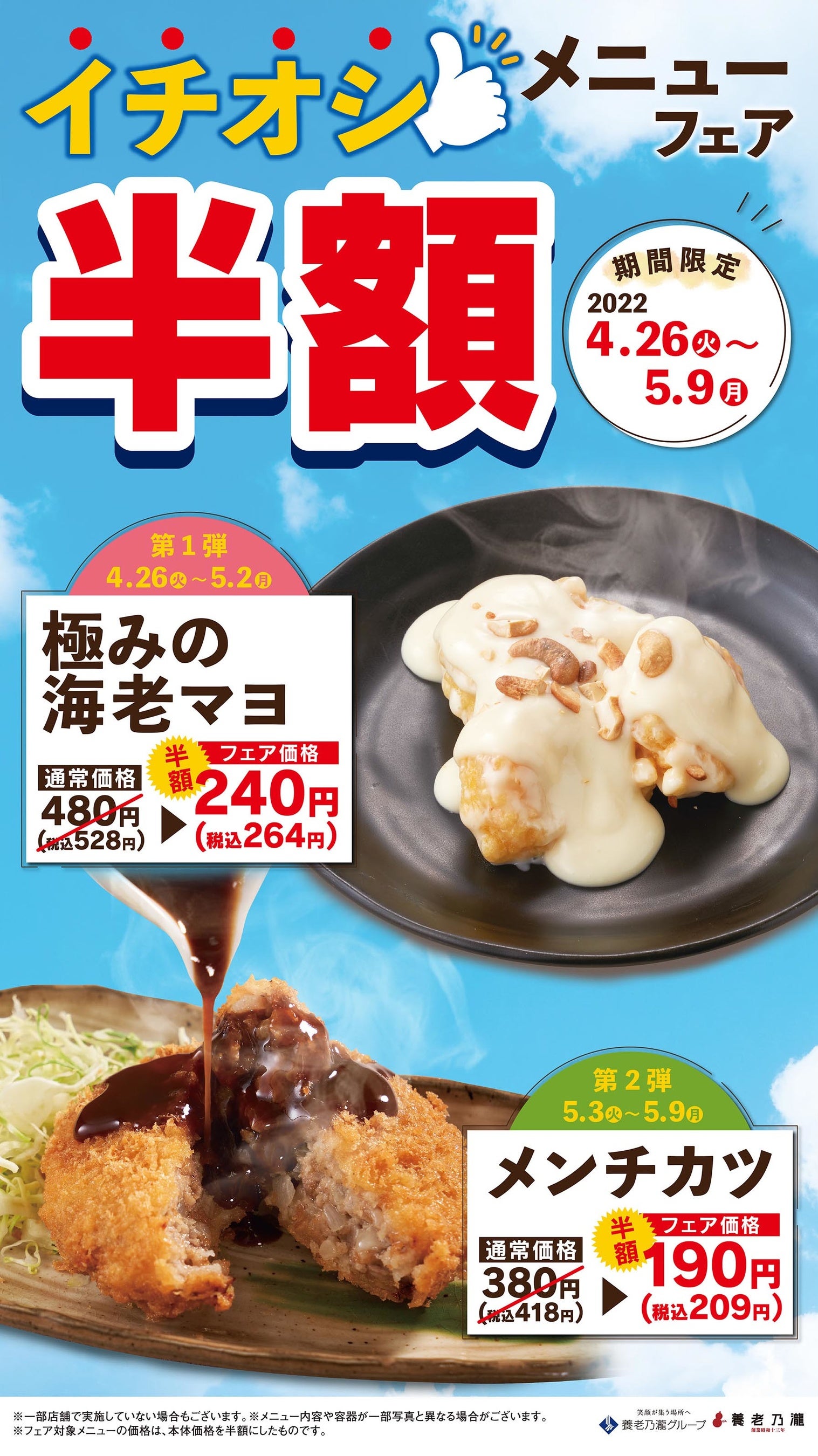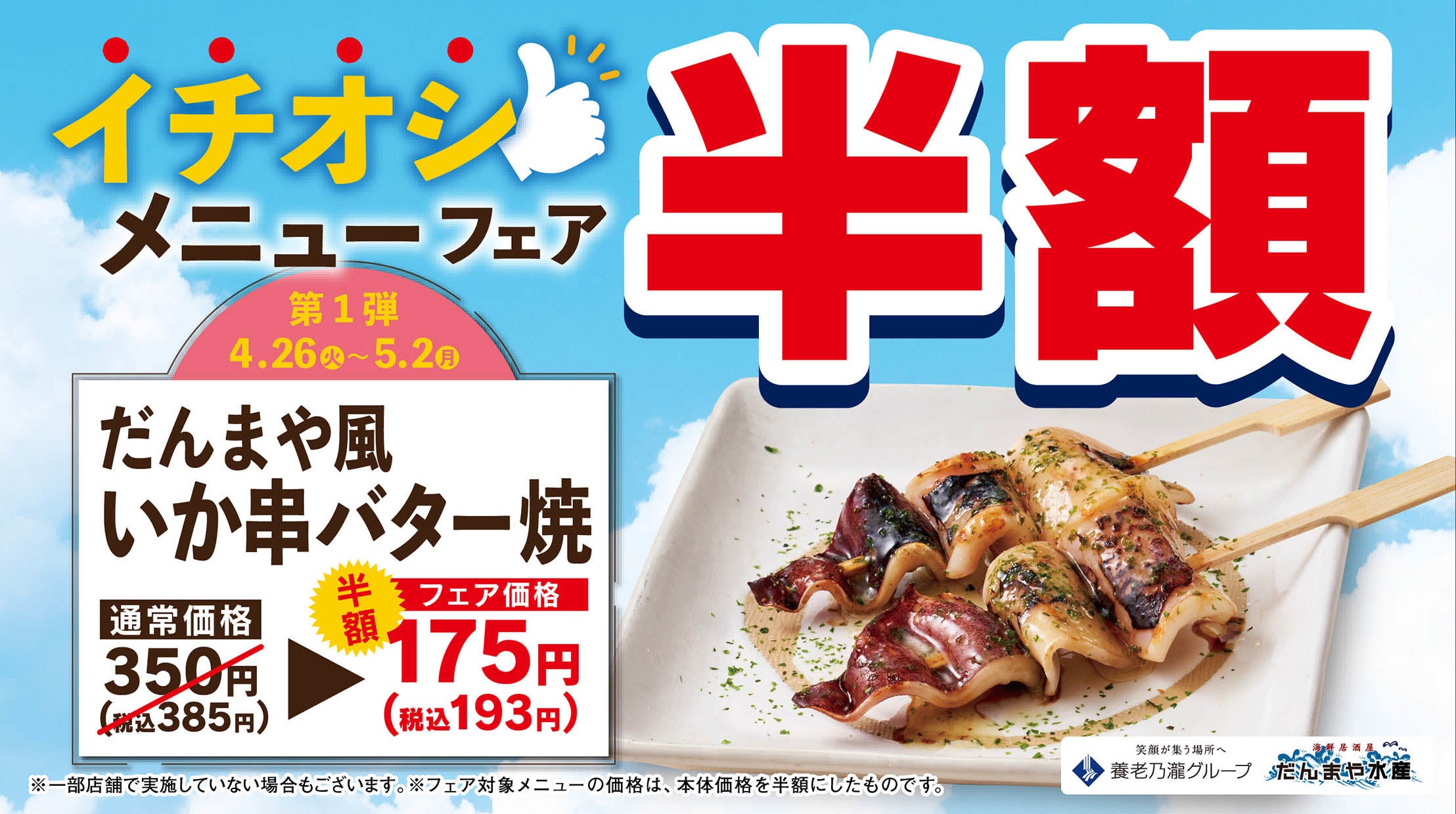 4月26日(火)のメニュー改定に伴い、対象のイチオシのメニューを半額で販売