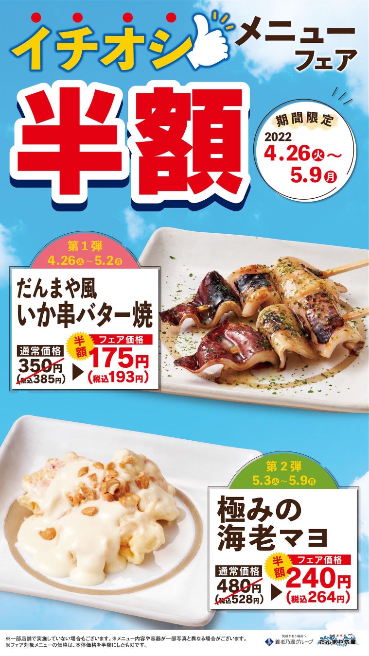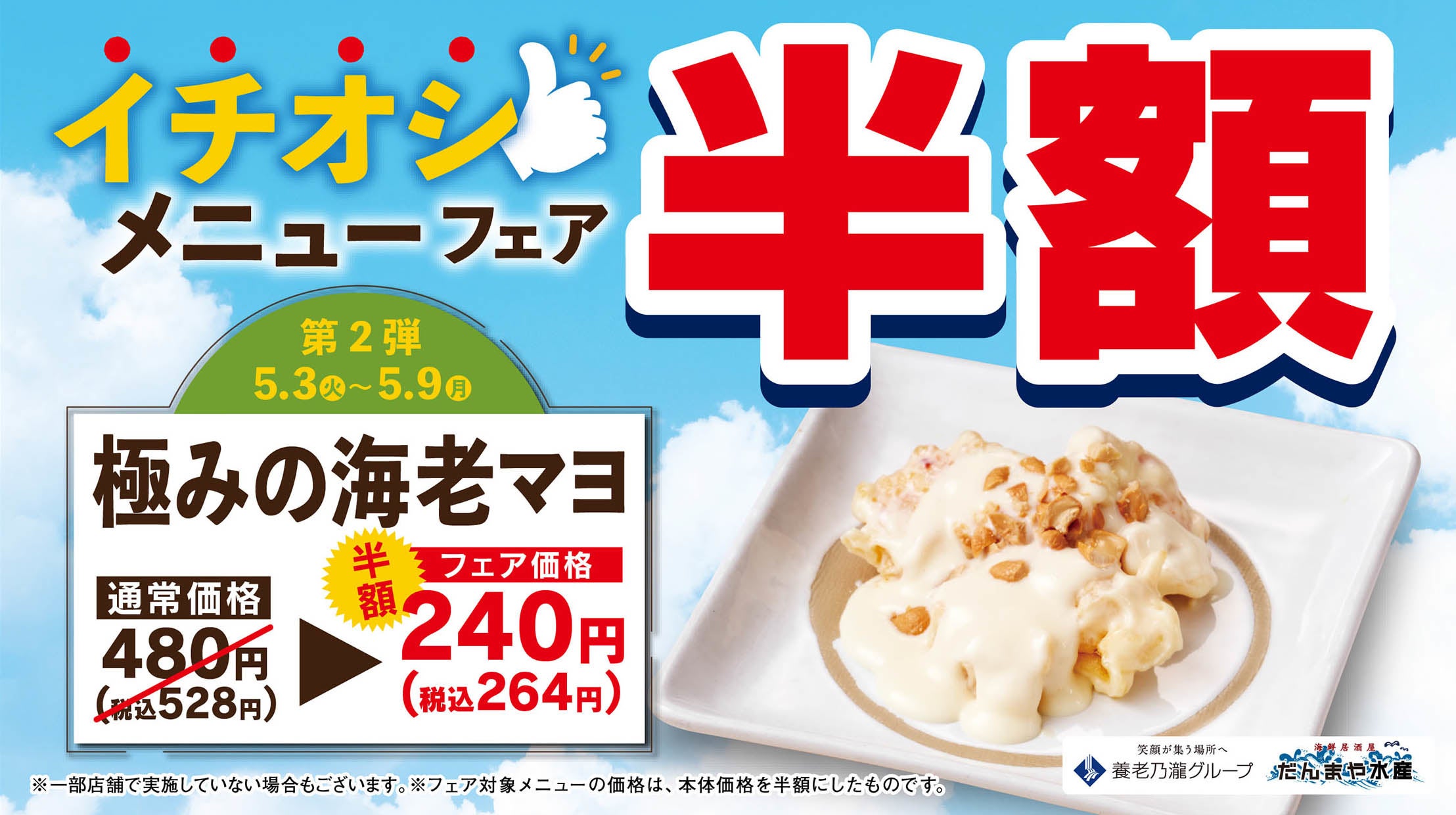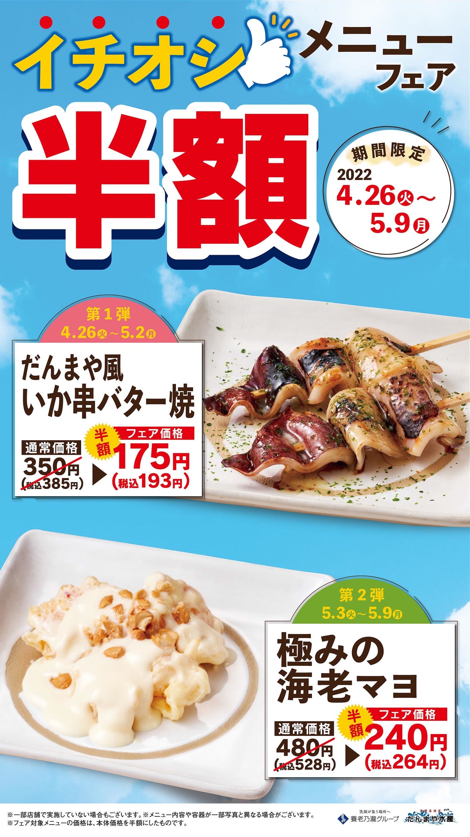 本フェアでは、新たに加わるメニューとリニューアルしたメニューについて、期間中、通常価格の半額でフェア対象のメニューを提供いたします。2022年4月26日(火)~5月2日(月)の第一弾では、養老乃瀧において、白くサッパリしたマヨネーズソースで仕上げた「極みの海老マヨ」を、だんまや水産においては、お客様の目の前でバターソースをかけて仕上げる「だんまや風いか串バター焼」を販売。2022年5月3日(火)~5月9日(月)の第二弾では、養老乃瀧において、更にジューシーで肉の旨味を感じる様になった「メンチカツ」、だんまや水産においては、「極みの海老マヨ」を販売いたします。