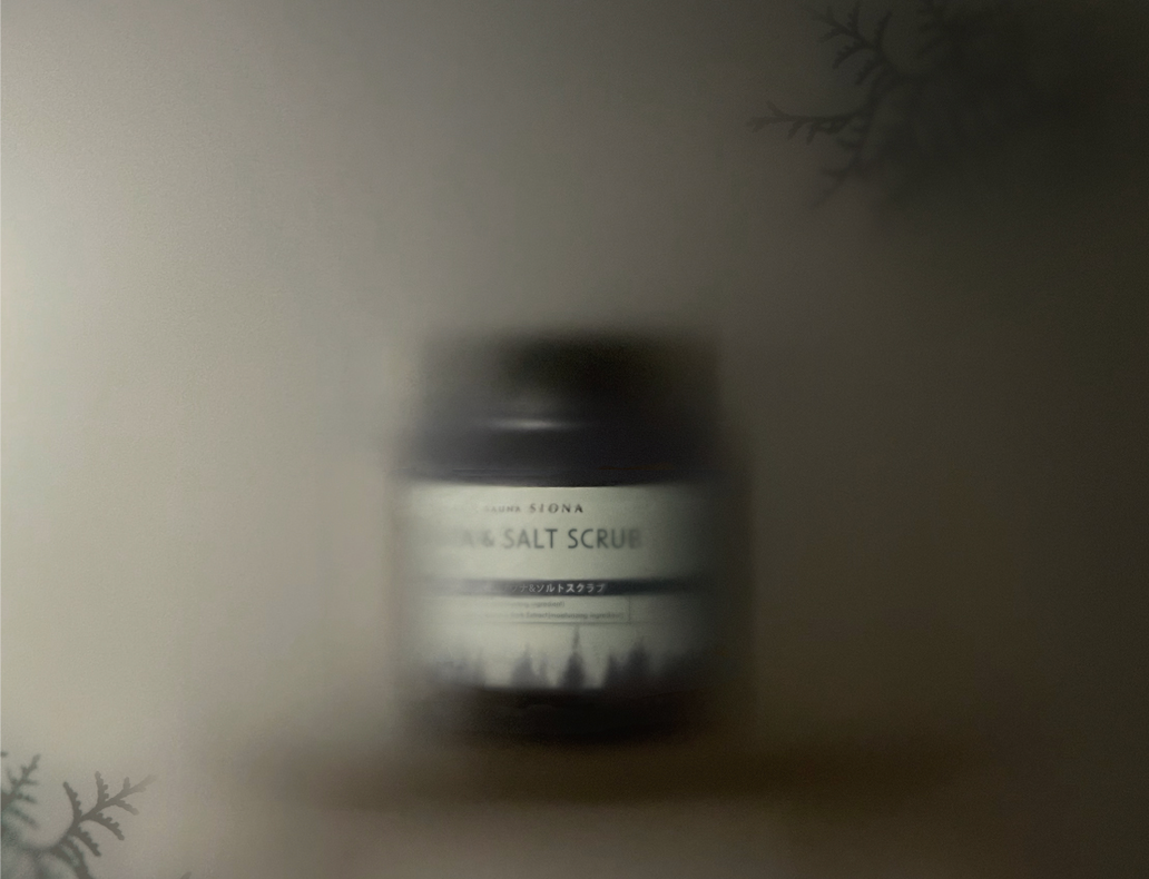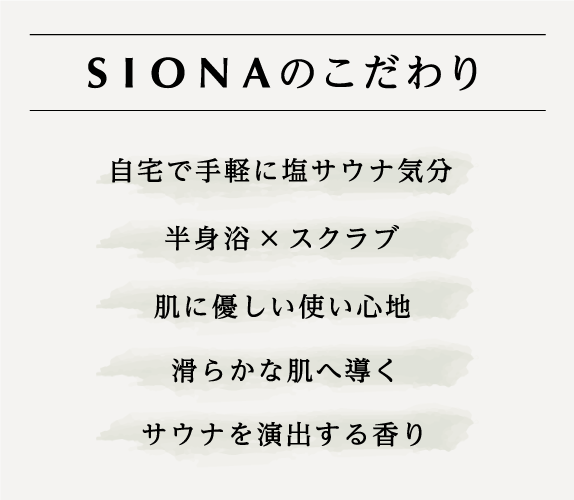 SIONAは、自宅で手軽に塩サウナ気分を味わえるよう、配合成分や肌にのせた時のテクスチャー、使用方法にこだわり、約2年の歳月をかけて開発したサウナ&ソルトスクラブです。