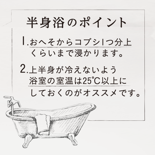 4- 40〜42℃のお湯に、10〜20分ほど半身浴をしていきます。