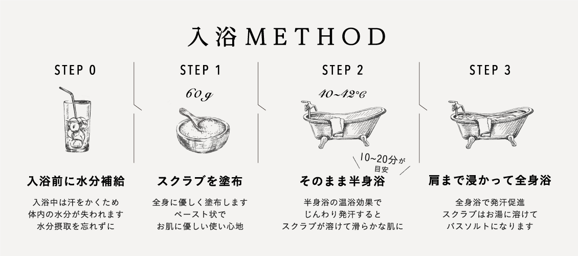 半身浴の温浴効果でじんわり発汗すると、体に塗ったスクラブが溶けて滑らかな肌へと導きます。