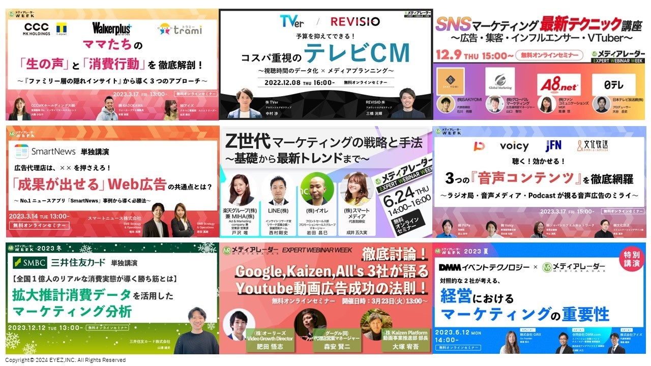 広告業界のプラットフォームであるメディアレーダーは、1週間でさまざまな広告・マーケティングジャンルのセミナーを行うオンラインセミナーイベント「メディアレーダーWEEK」を年4回(3月・6月・9月・12月)開催しています。