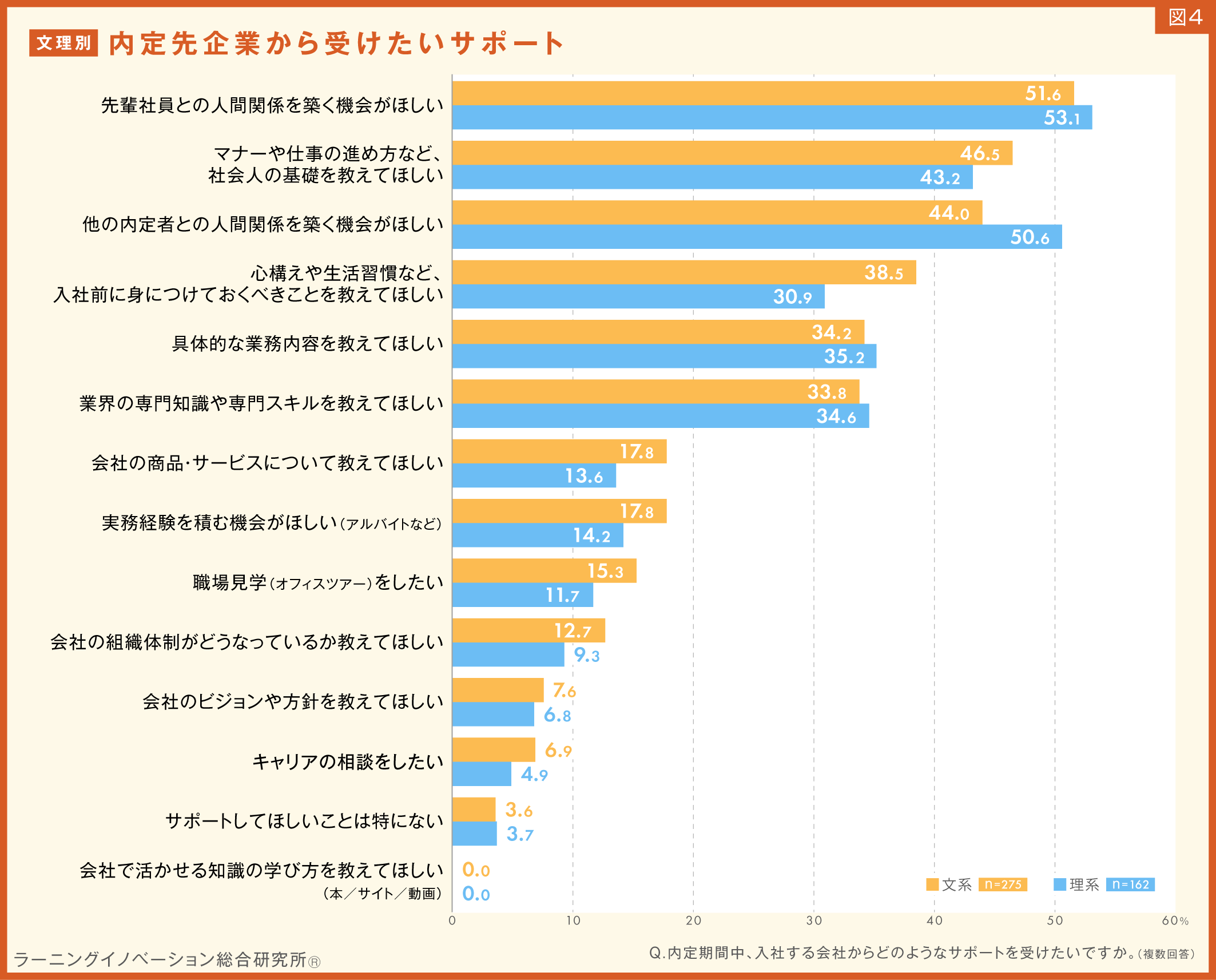 4.内定期間中に会社から受けたいサポート、文理ともに「先輩社員との関係築く機会」が半数超で1位。2位以下は文系・理系で違い