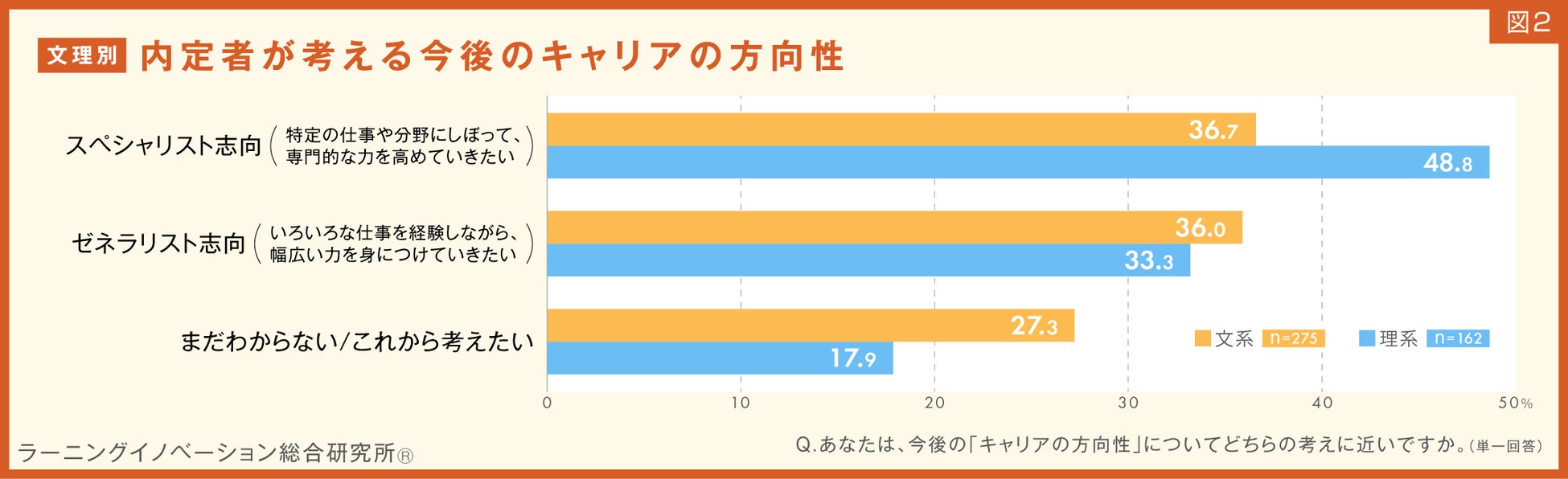 理系は「スペシャリスト志向(特定の仕事や分野にしぼって、専門的な力を高めていきたい)」が突出しており、約半数の48.8%。「ゼネラリスト志向(いろいろな仕事を経験しながら、幅広い力を身につけていきたい)」は33.3%で、「まだわからない/これから考えたい」は文系より9.4ポイント低い17.9%でした(図2)。