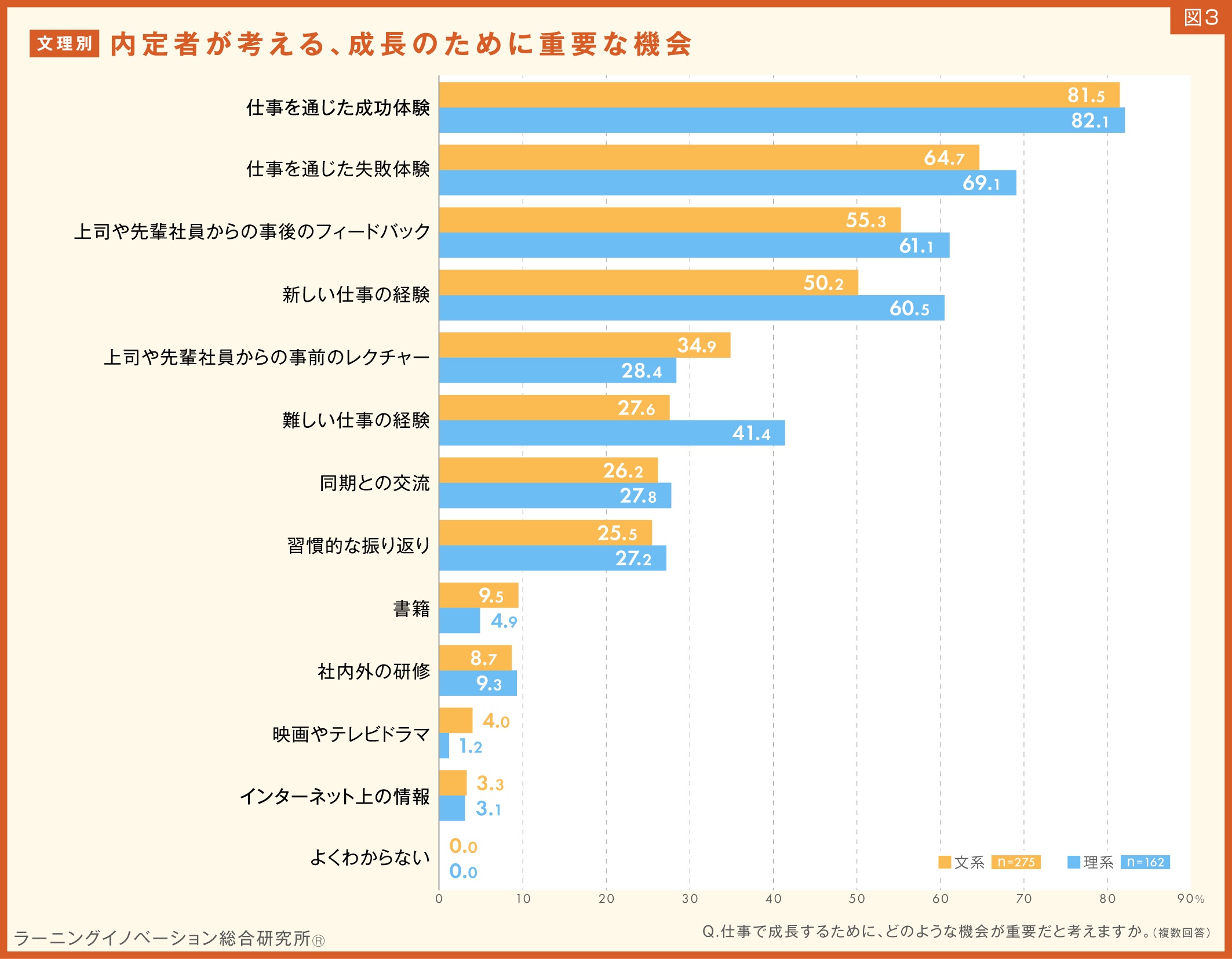 結果、どちらも「仕事を通じた成功体験」(文系:81.5%/理系:82.1%)が8割を超え、トップでした。2位に「仕事を通じた失敗体験」(文系:64.7%/理系:69.1%)、3位に「上司や先輩社員からの事後のフィードバック」(文系:55.3%/理系:61.1%)が続き、同じ順位となりました。