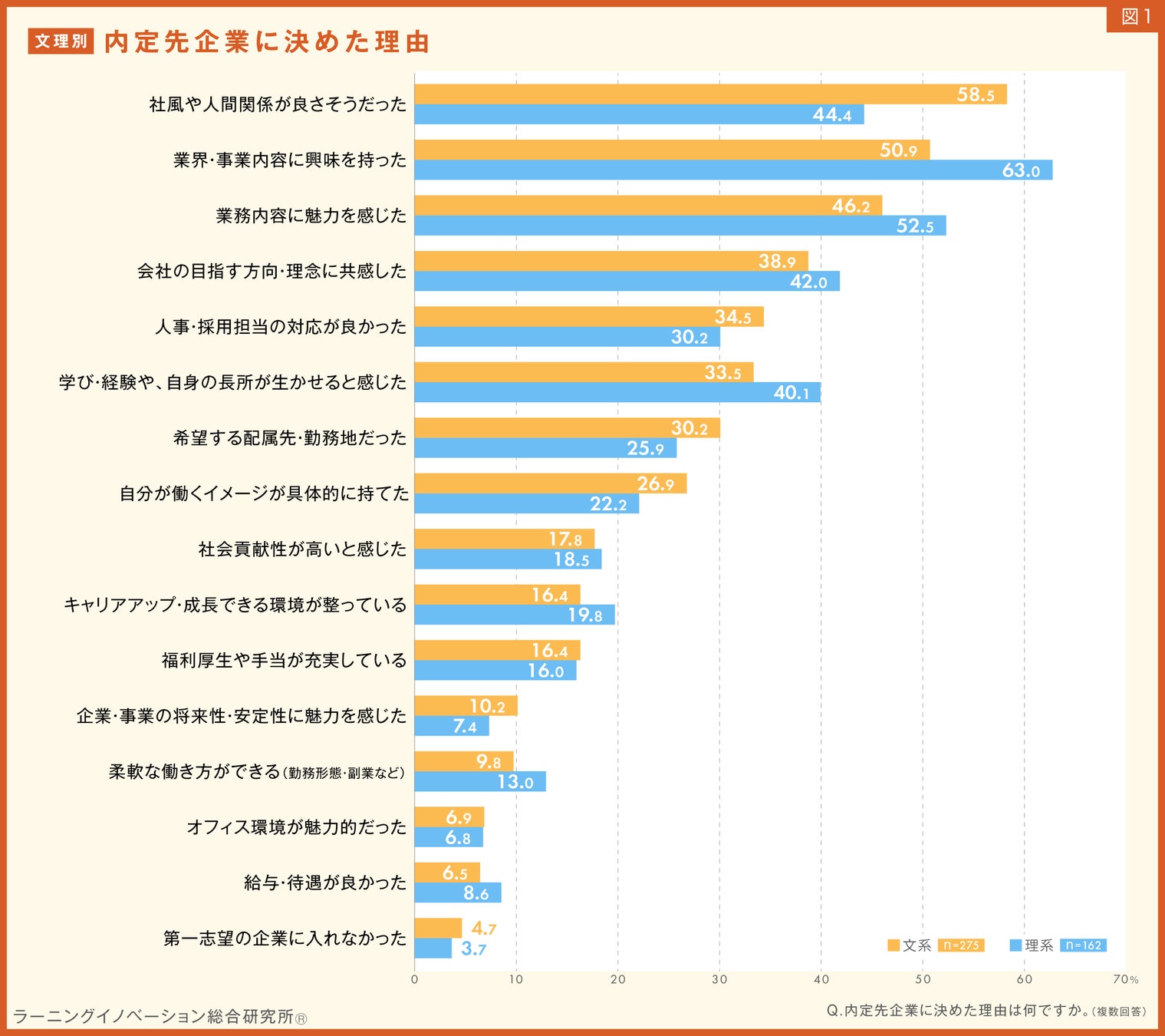 理系の2位は「業務内容に魅力を感じた」(52.5%)、3位は「社風や人間関係が良さそうだった」(44.4%)で、2位・3位も文系と理系で違いが表れました(図1)。