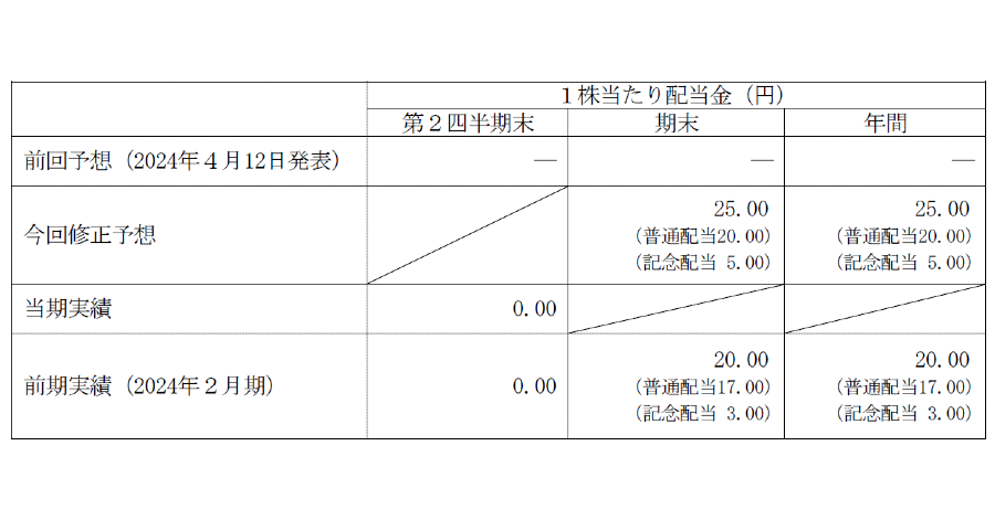 これにより、記念配当を含む2025年2月期の期末配当予想につきましては、前期より1株につき5円の増配となる、1株当たり25円(普通配当20円、記念配当5円)の予定とさせていただきます。
