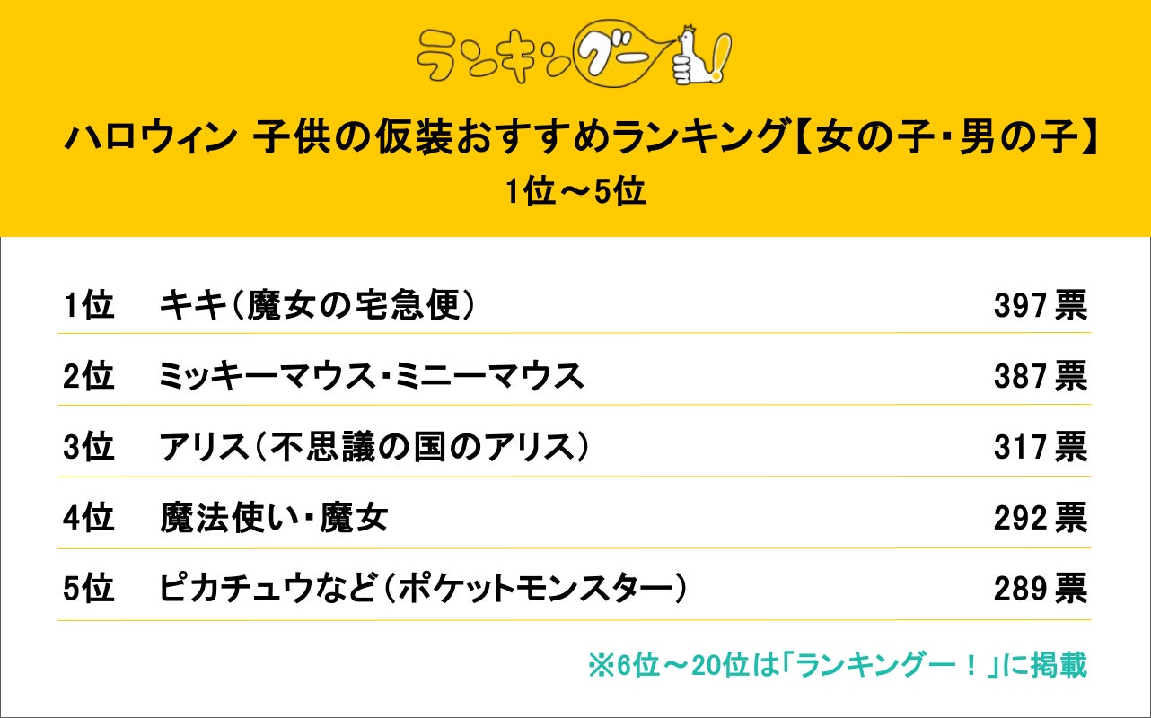 ランキングー!ではハロウィンにぴったりの子供の仮装を調査し、全年代の男女(性別回答しないを含む)8,873名にアンケートを行い、TOP20を決定しました。ここではTOP5をご紹介します。