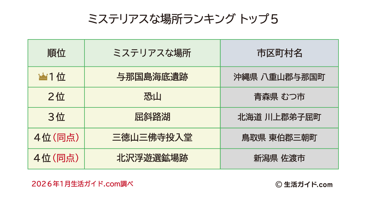 このランキングは、全国各地にある「なぜ此処にこんなものが?」と思うようなものや、そこに行くと不思議な何かを感じるような気がする『ミステリアスな場所』を、生活ガイド.com運営事務局が厳選し、生活ガイド.com会員に投票してもらい決定いたしました。