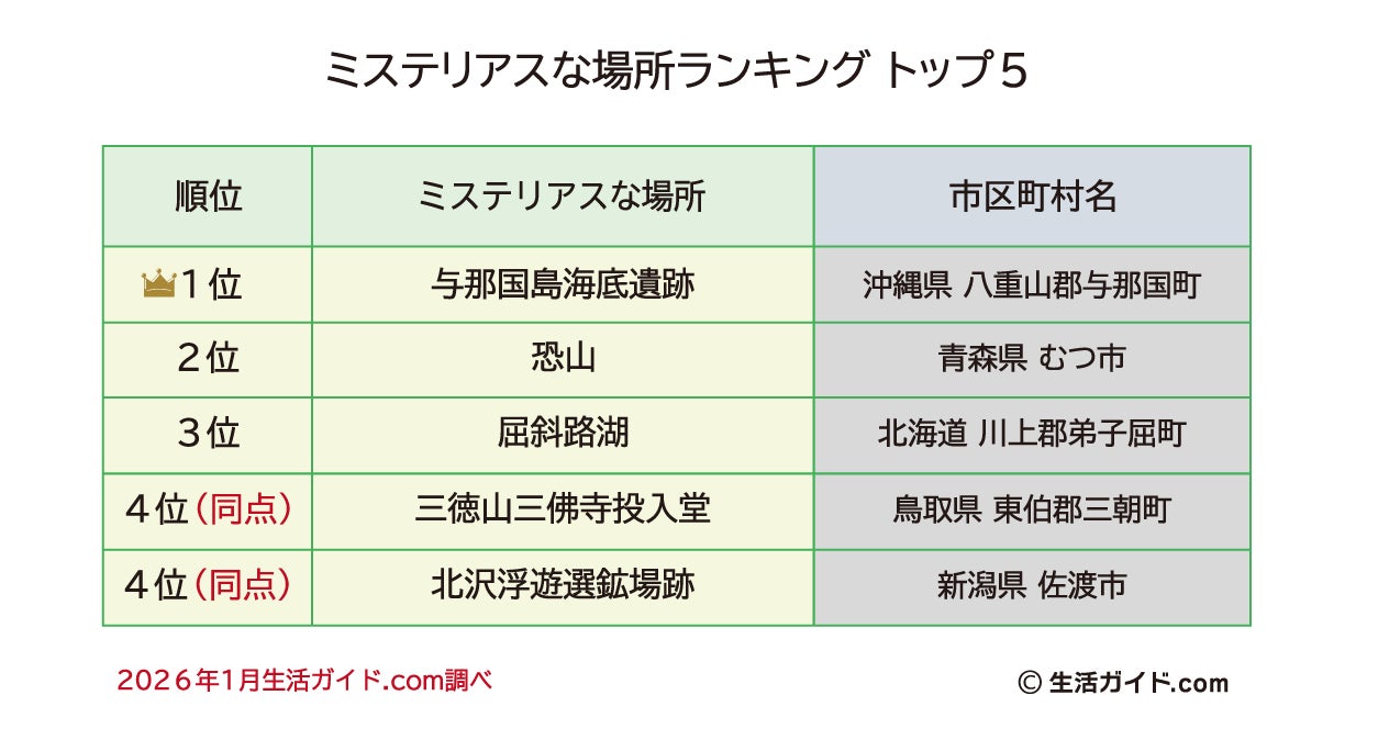 株式会社ウェイブダッシュ(本社:東京都千代田区、代表取締役社長 下山 一美)が運営する、みんなでつくる地域応援サイト「生活ガイド.com」(https://www.seikatsu-guide.com/) は、みんなのランキング第55回「ミステリアスな場所ランキング」のトップ5を発表いたしました。