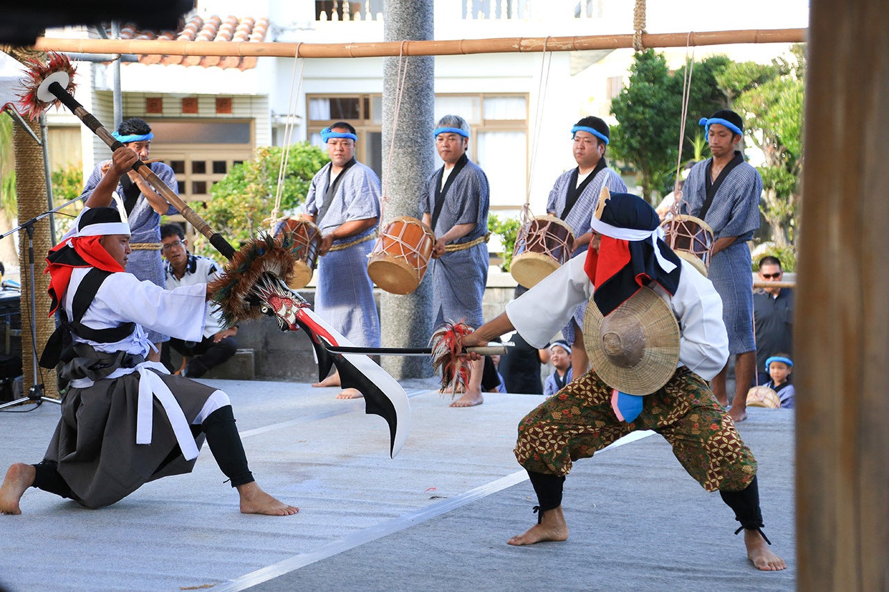 豊年祭は毎年6月以降の吉日に行われ、年中行事の中で最も賑やかな祭りです。その年の豊年を感謝し祝うとともに、来年の豊年を祈願します。島のそれぞれの集落が旗頭を立て、棒踊り・舞踊などが披露されます。また、2年に1度、東西に分かれての大綱引きが行われます。