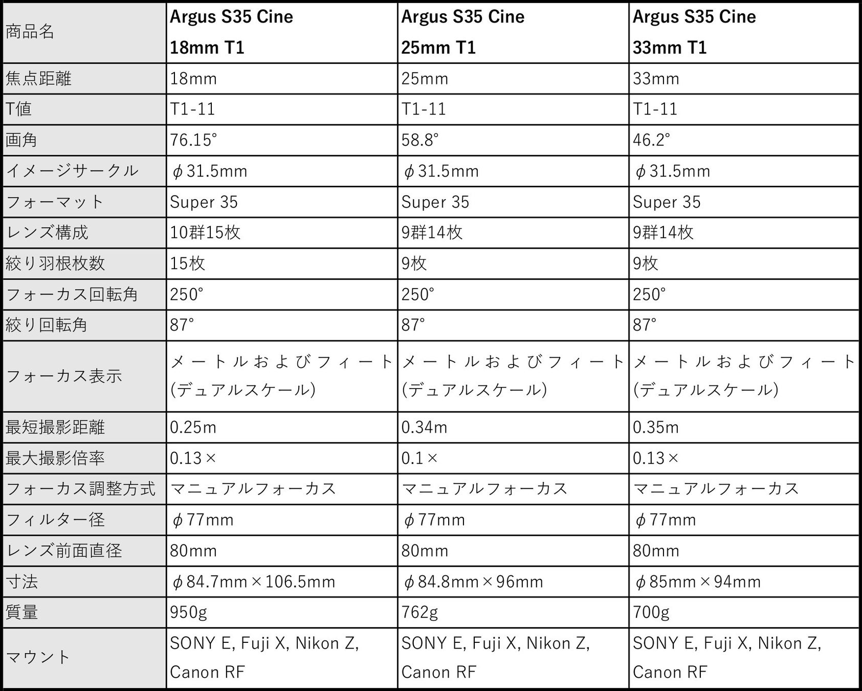 Argus S35 レンズ単品:各195,000円前後/ 3本バンドルセット:各521,000円前後