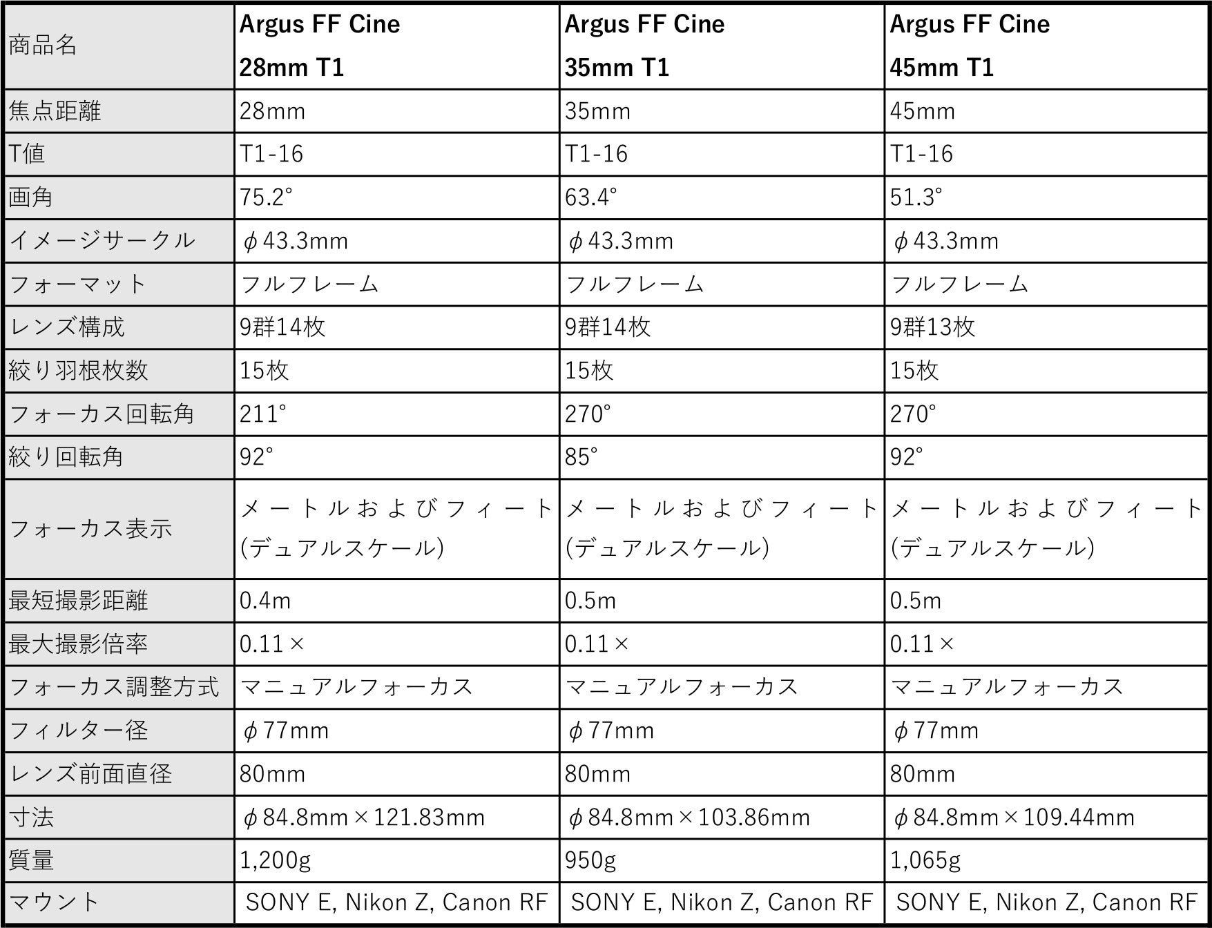 Argus FF レンズ単品:各326,000円前後/ 3本バンドルセット:各858,000円前後