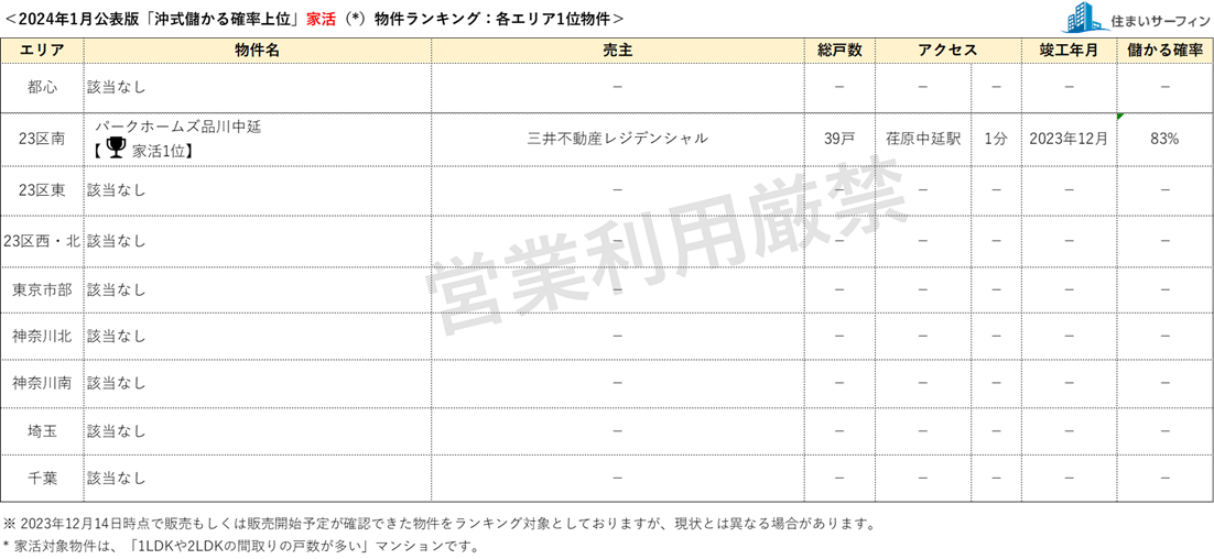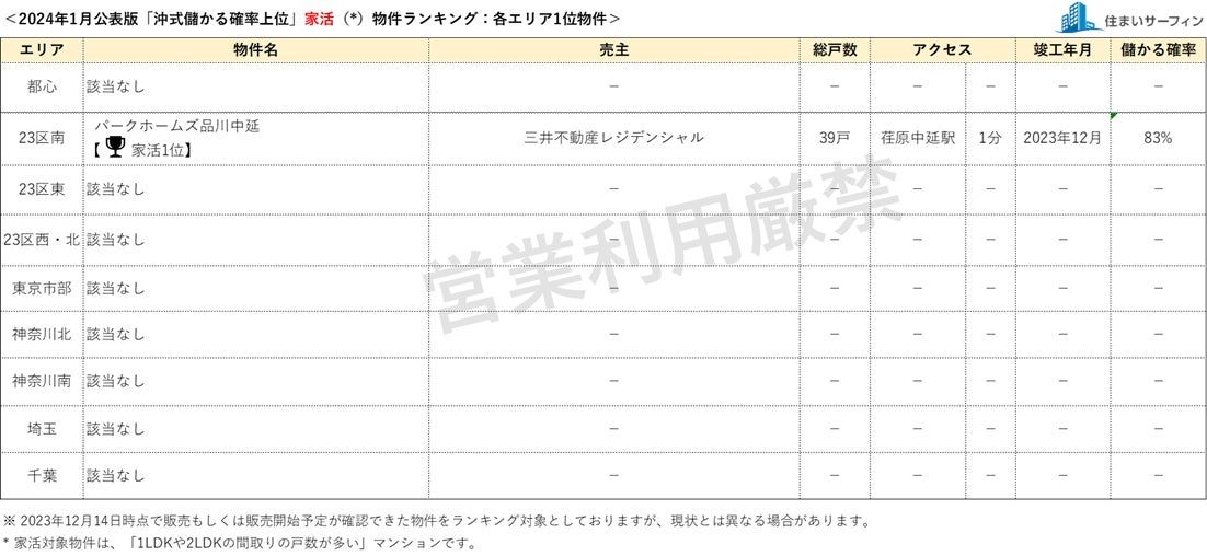 [住まいサーフィン]資産性の保たれやすいマンションがわかる首都圏エリア別「沖式儲かる確率上位マンションランキング」2024年1月版公表