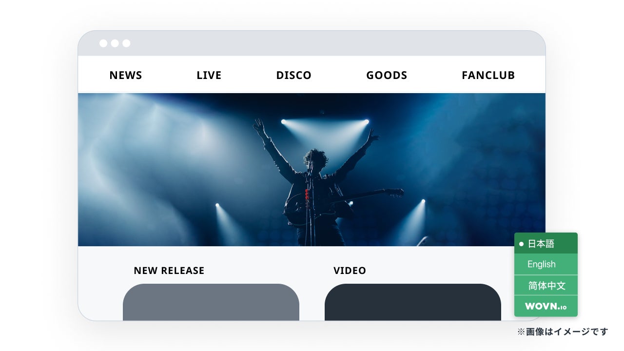 WOVN.io は国際特許取得済みの「未翻訳箇所の自動検知・翻訳」技術を活用することで、更新頻度の高い動的サイトでも、翻訳リソースをかけることなくタイムリーに多言語での情報発信が可能となります。また、アーティスト名やファンネームなど独特の固有名詞も用語集機能へあらかじめ登録することで、未然に誤訳を防ぐことも可能です。