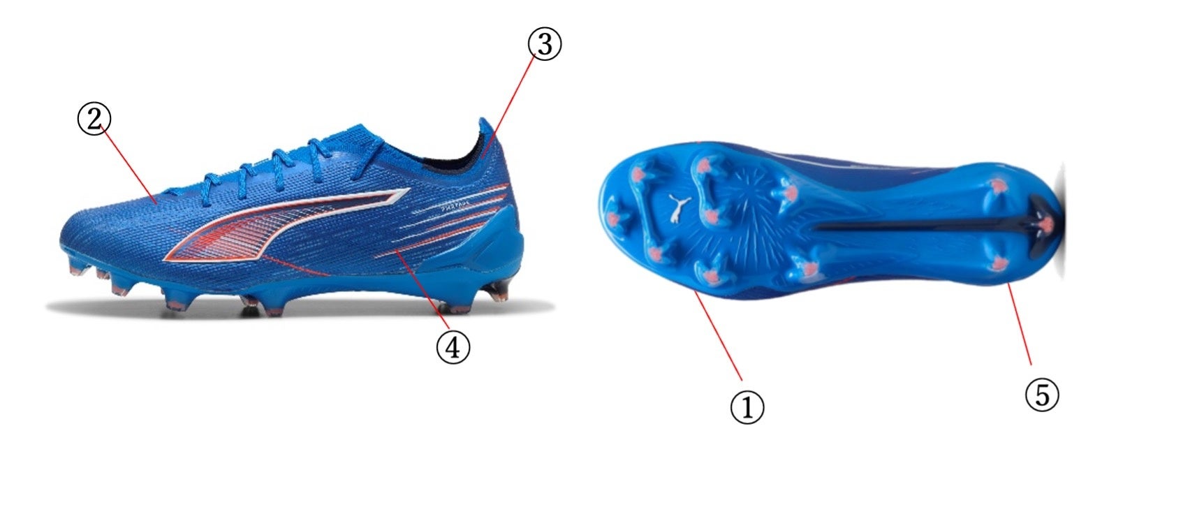 ULTRA専用に開発されたプーマ独自のアウトソール。軽量なPebax素材を使用し、革新的なスタッドシステムがピッチをしっかり掴み、強力な蹴り出しと加速力を生み出します。エネルギーリターンを最大化し、更なる加速を実現します。