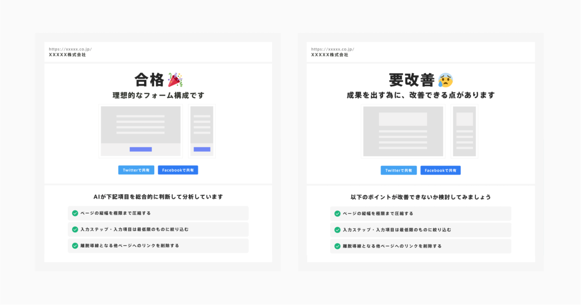 AIがフォームの情報を取得し、勝ちパターンに適合しているかを自動で判定します。判定結果は「合格」「要改善」のいずれかが表示されます。