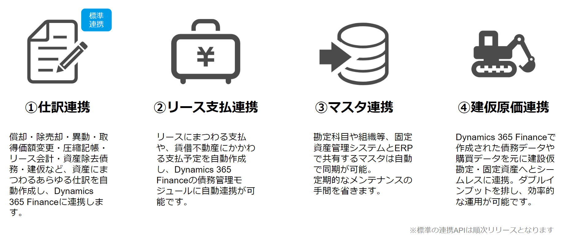 そこで、日本における固定資産管理に特化したシステムである「HUE Asset」は、グローバルで展開されているクラウド型ERPソリューションである「Dynamics 365 Finance」と標準の連携ツールを提供し、構築時におけるシームレスな連携を実現します。資産の償却や除売却仕訳を連携できるのはもちろん、リースや不動産の支払連携、マスタの同期、購買・買掛金データに基づく建設仮勘定の計上など、大手企業の要件水準に対応した高度な連携を実現できます。
