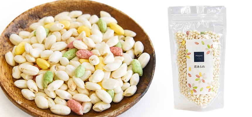 ふんわり軽い食感のライスパフを、やさしい⾊味に仕上げた「花あられ」です。⼝の中でほろっとほどける、素朴な甘さが特徴です。これから始まる花の季節にいつものフードに少しふりかければ彩り豊かに、またそのまま⼿のひらに載せてオヤツにも使えます。