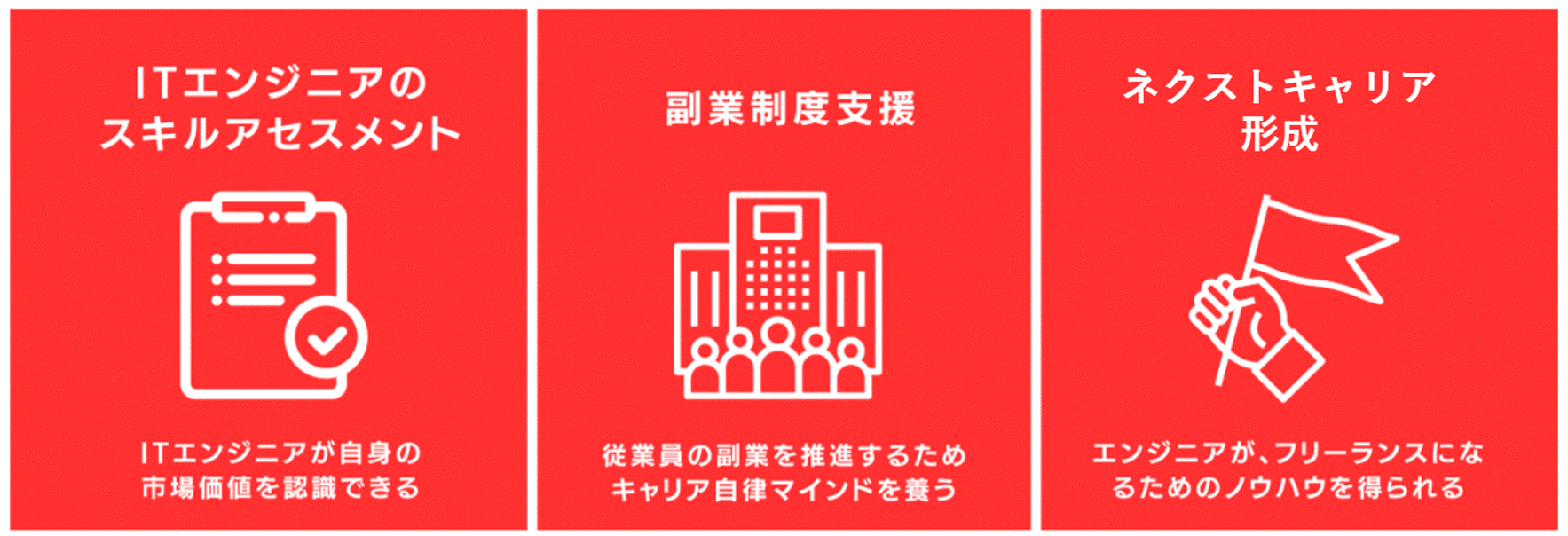 会社員との違いや、会計、社会保障、税金といった実務的な側面から関係法令に至るまで、副業・フリーランスとしての働き方を幅広く学び、外部でも就業できる環境を所属企業が福利厚生として提供する、エンジニア育成支援サービス。従業員はキャリア選択肢の幅が広がり、自身のキャリアについて再認識することができる。またキャリアアップに向けた意識改革ができる。また、企業は組織の活性化を図ることができ、またネクストキャリアの提示が可能となるなど企業ブラントの向上に繋げることができます。