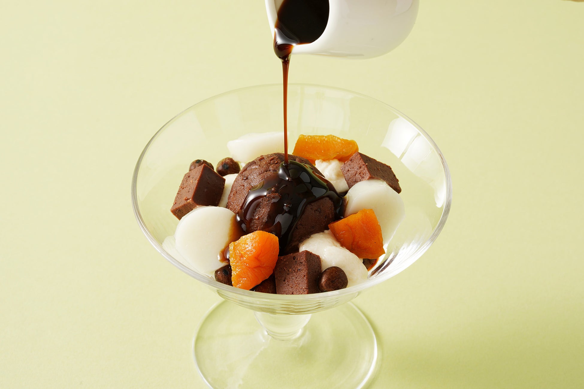カカオの果肉やチョコレートのフルーティさがあることで、フルーツあんみつのようにお楽しみいただけます。とろりとした黒蜜をかけてお召し上がりください。