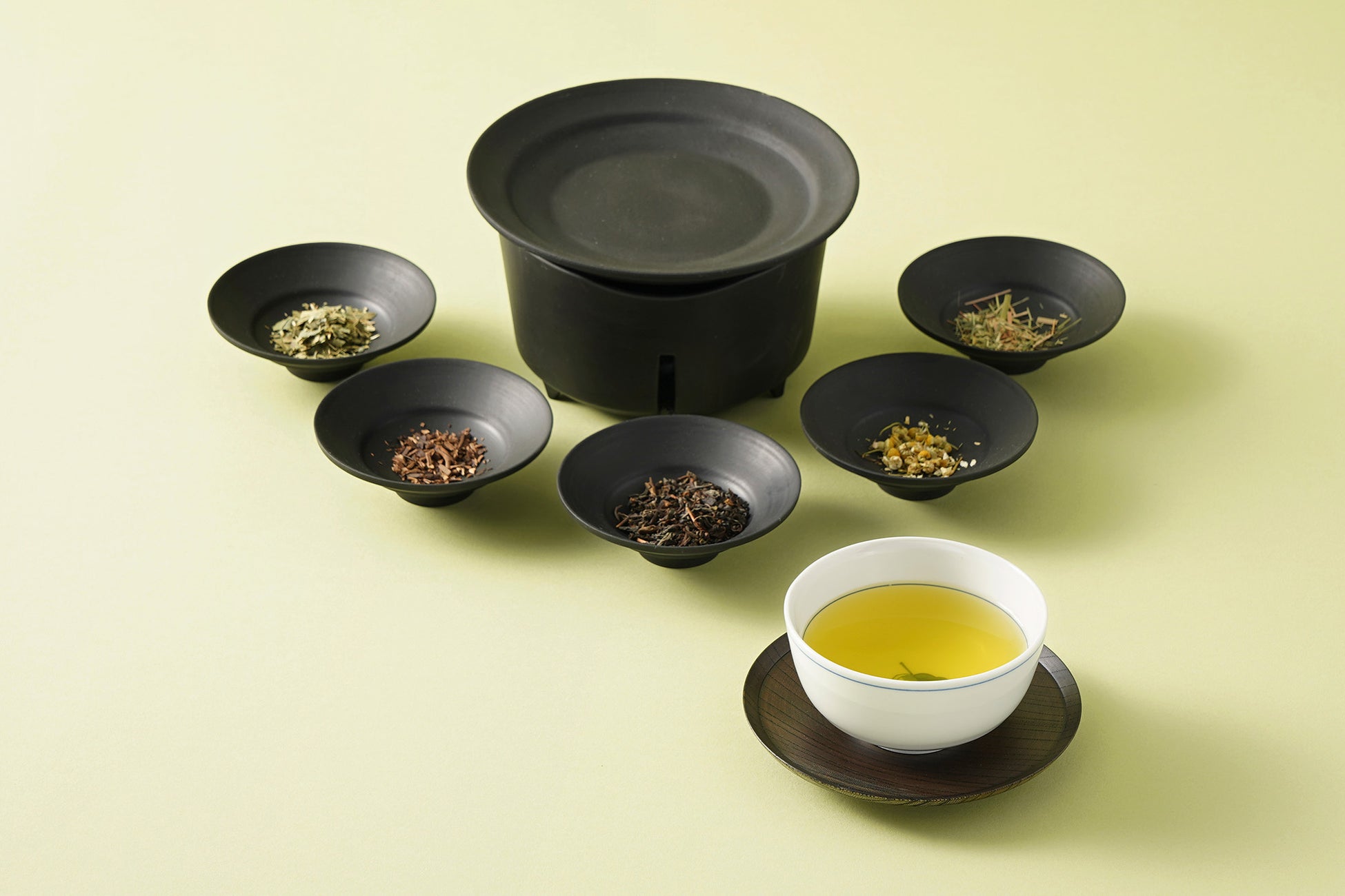 コースの最後には、国産のカモミールやレモングラス、ビワの葉等の5種の野草をその場で茶香炉を使い焙じながらブレンドする、「野草茶」をご用意しています。