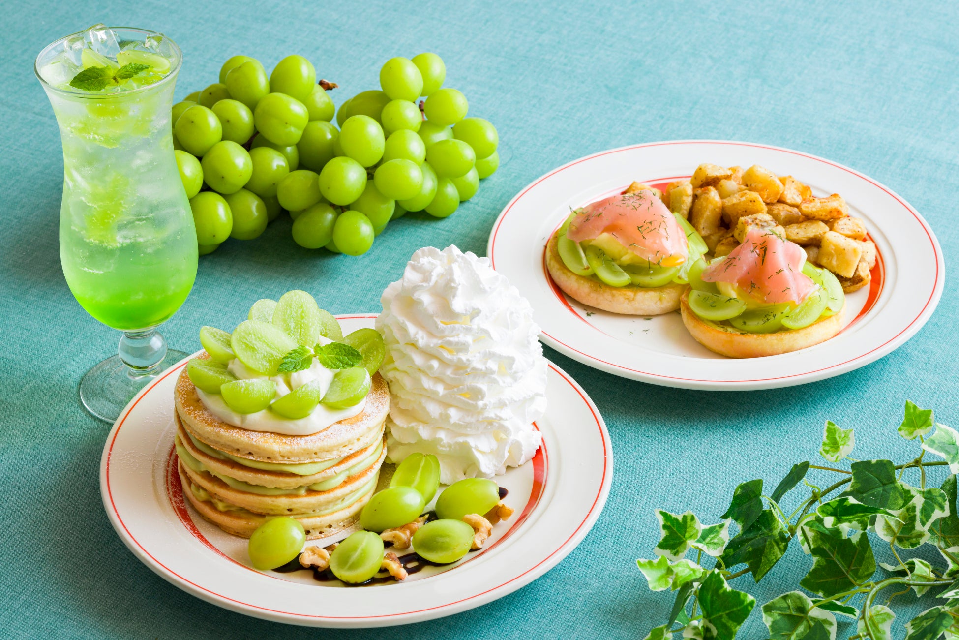 【Eggs ’n Things】“果実の宝石”シャインマスカットの贅沢パンケーキ登場!「シャインマスカットのパンケーキ」「シャインマスカットと生ハムのオープンサンド」8月27日(火)~9月24日(火)
