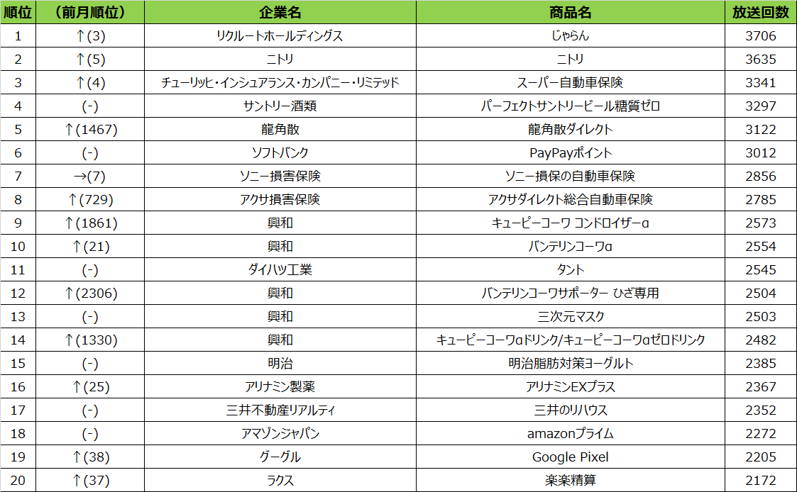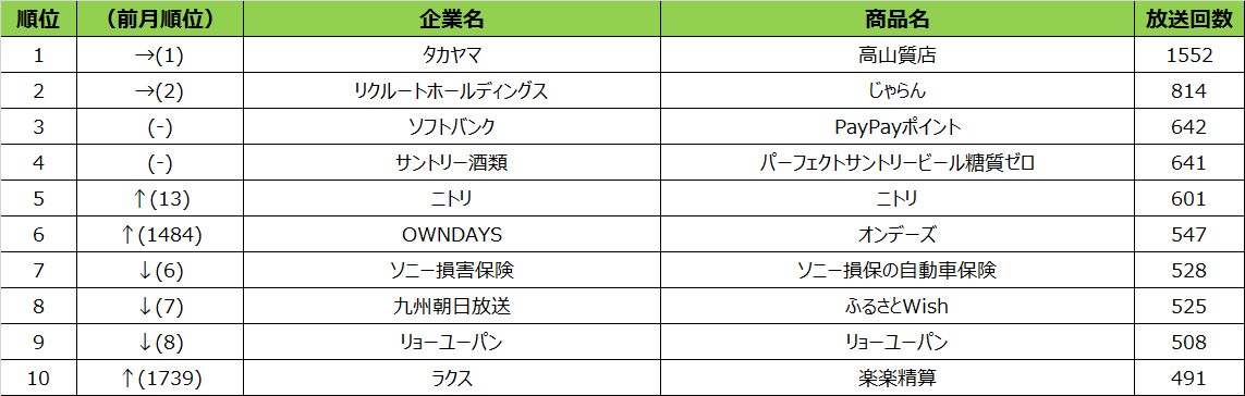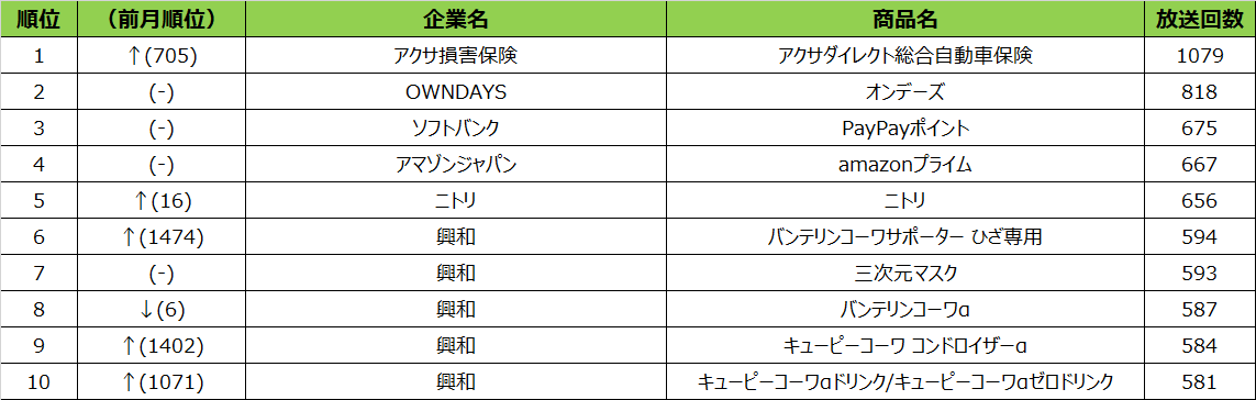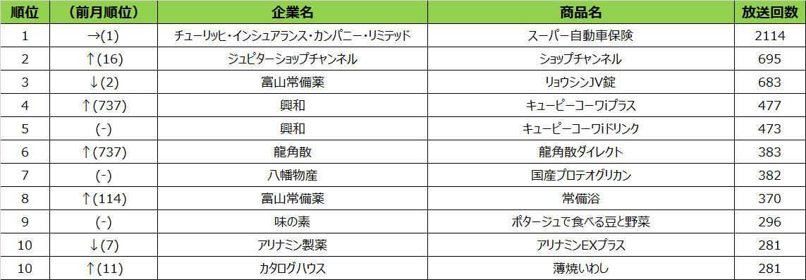 今回のランキングは、興和が5つランクインし、存在感を出していました。興和は多くの月で上位にランクインしておりますが、季節の変わり目となる10月度は、人々の健康を商品でサポートするために、放送回数を増加させたのではないでしょうか。