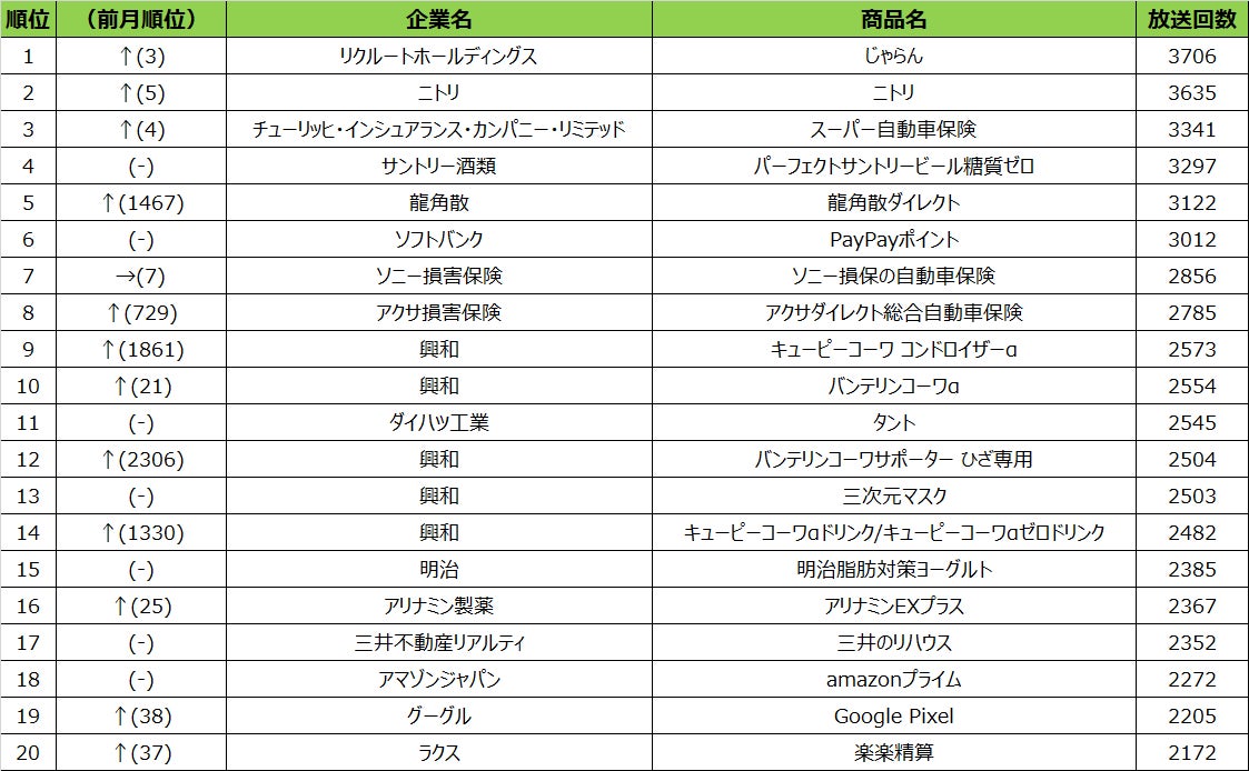 2022年10月度テレビCM放送回数ランキング発表~季節の変わり目に健康をサポートする興和の台頭が目立つ結果に~