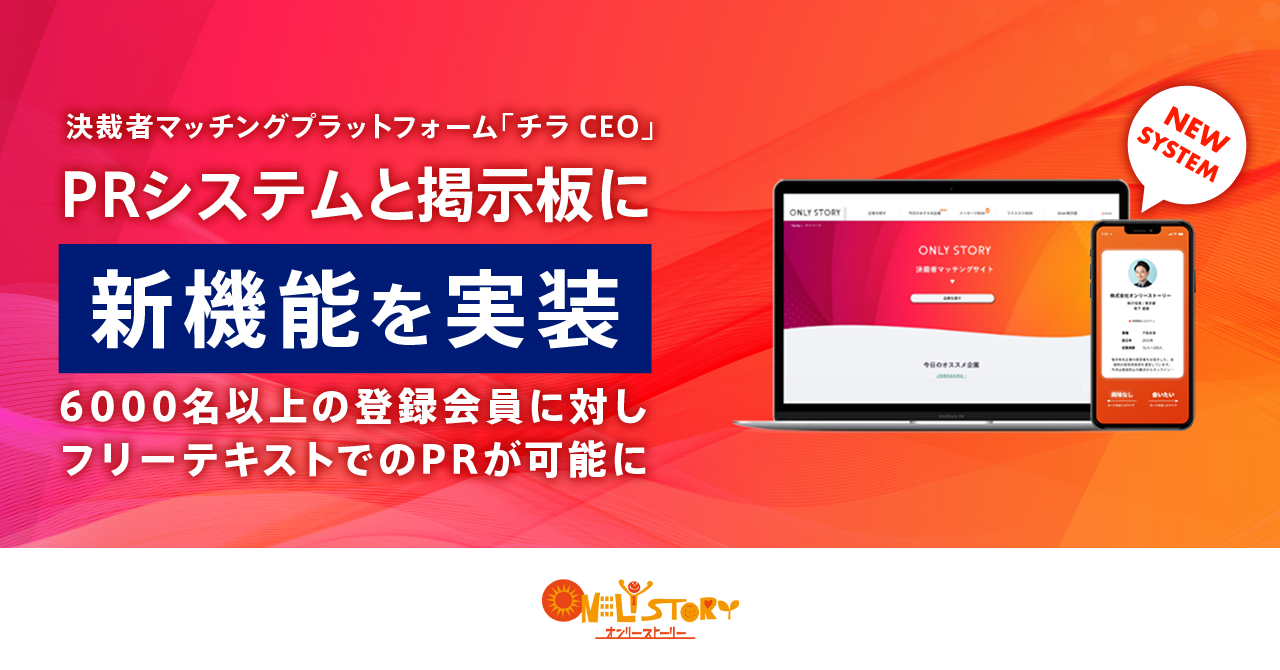 審査制・決裁者マッチングプラットフォーム「ONLY STORY」「チラCEO」(サービスサイト:https://onlystory.co.jp/service/ )を運営する株式会社オンリーストーリー(代表取締役:平野哲也、本社:東京都渋谷区)は、登録決裁者へのPR機能(プラットフォーム内広告)と掲示板機能の2つに新機能を追加したことをお知らせいたします。