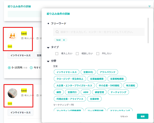 フリーワードで検索した際、ヒットしたワードにハイライトが入るようになりました。