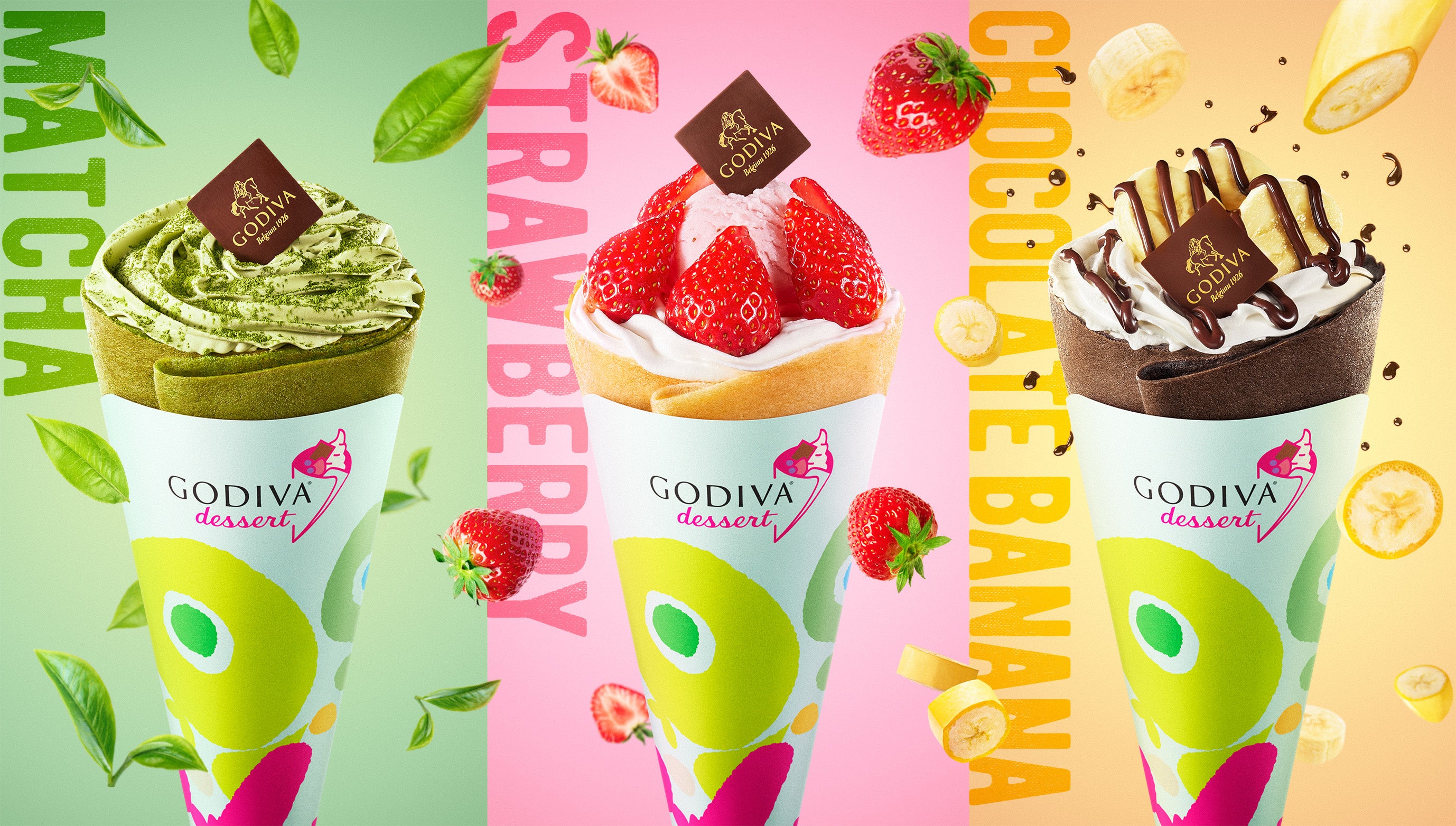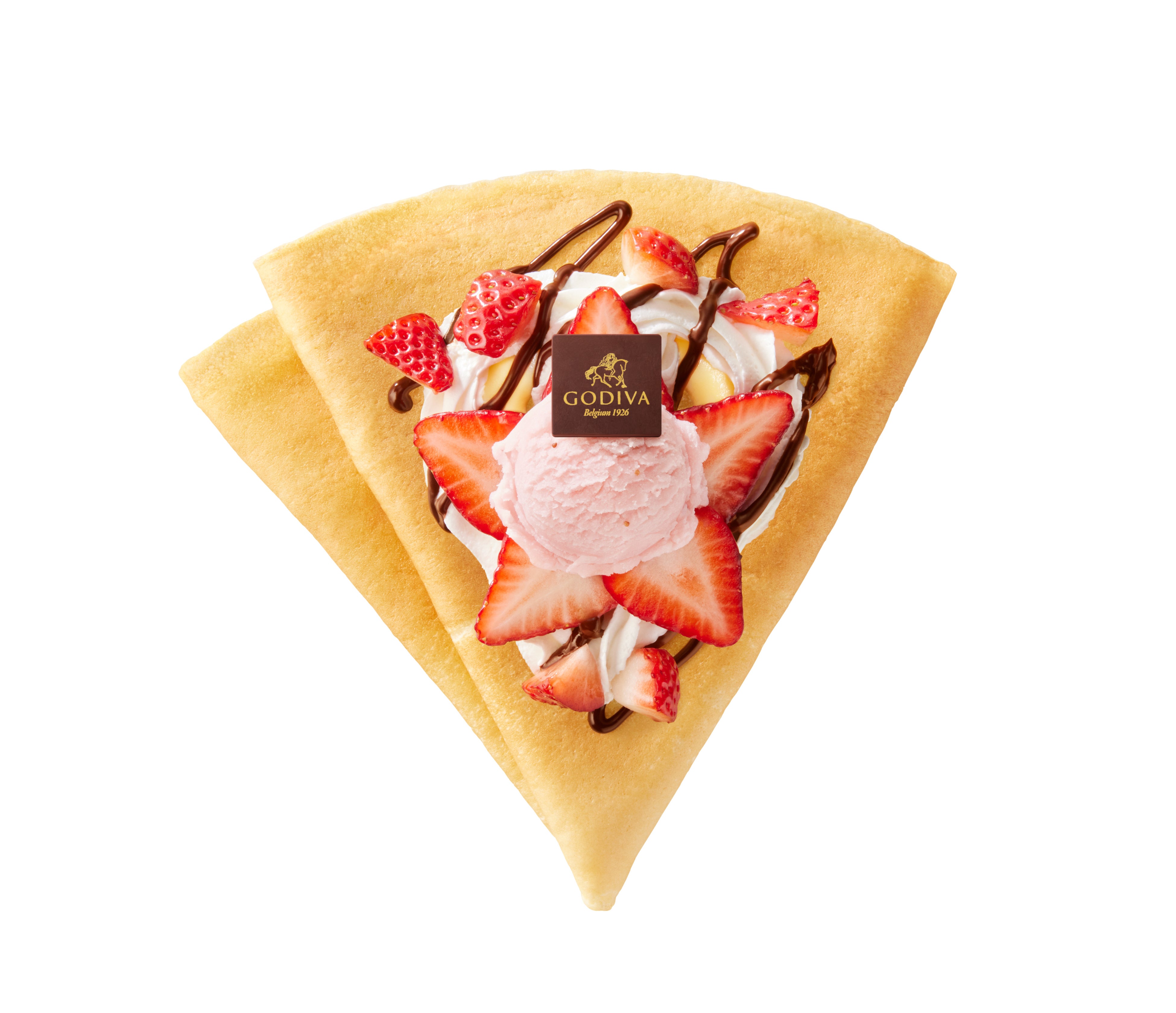 ゴディバの濃厚なミルクチョコレートを、シンプルなプレーン生地が引き立てる『クレープ ミルクチョコレート』や、ゴディバのダークチョコレートと相性が良いフレッシュなストロベリーをトッピングした『クレープ ストロベリーチョコレートアイスクリーム』、口溶けの良い生チョコレートをふんだんに使い、リッチでスペシャルな味わいの『スペシャルクレープ 生チョコレート』など全12フレーバーが登場します。また、期間限定のシーズナル商品も販売予定です。