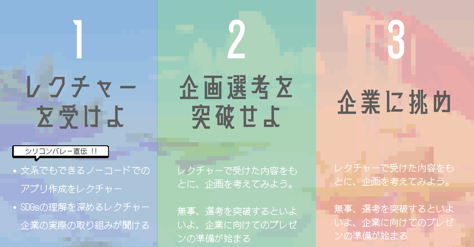 2つ目の特徴は、希望した学生は事前レクチャーを受けられること。「SDGs」という身近でありながら複雑なテーマで企画を考えてもらうため、実際に企業の「SDGs」への取り組み事例を紹介し、課題と解決方法についてインプットの機会を提供します。また、アプリを企画してもらうため、ノーコードでのアプリの作り方もレクチャーします。これにより、より多くの学生が挑戦できる環境をつくります。
