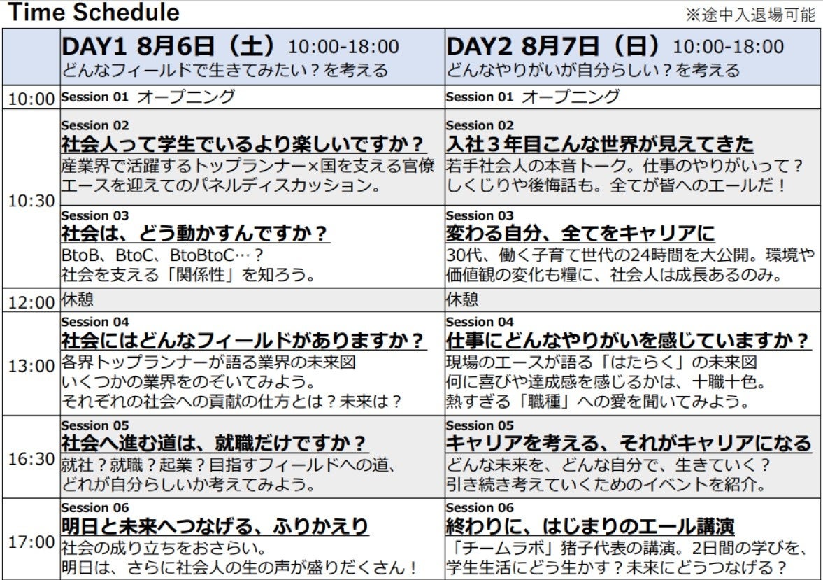 就職活動の早期化により、早くから「はたらく」の視野を広げる必要がある一方で、自身がどの領域に関心があり、また、どのようなことにやりがいを感じるか、明確になっていない学生も多いのが実態です。そこで、本イベントは、はたらくことのやりがいを知り、業種や職種の理解を深めることで視野を広げ、その上で「どのようなキャリアを歩みたいか」考えるきっかけとなる場を提供することを目的に開催しました。