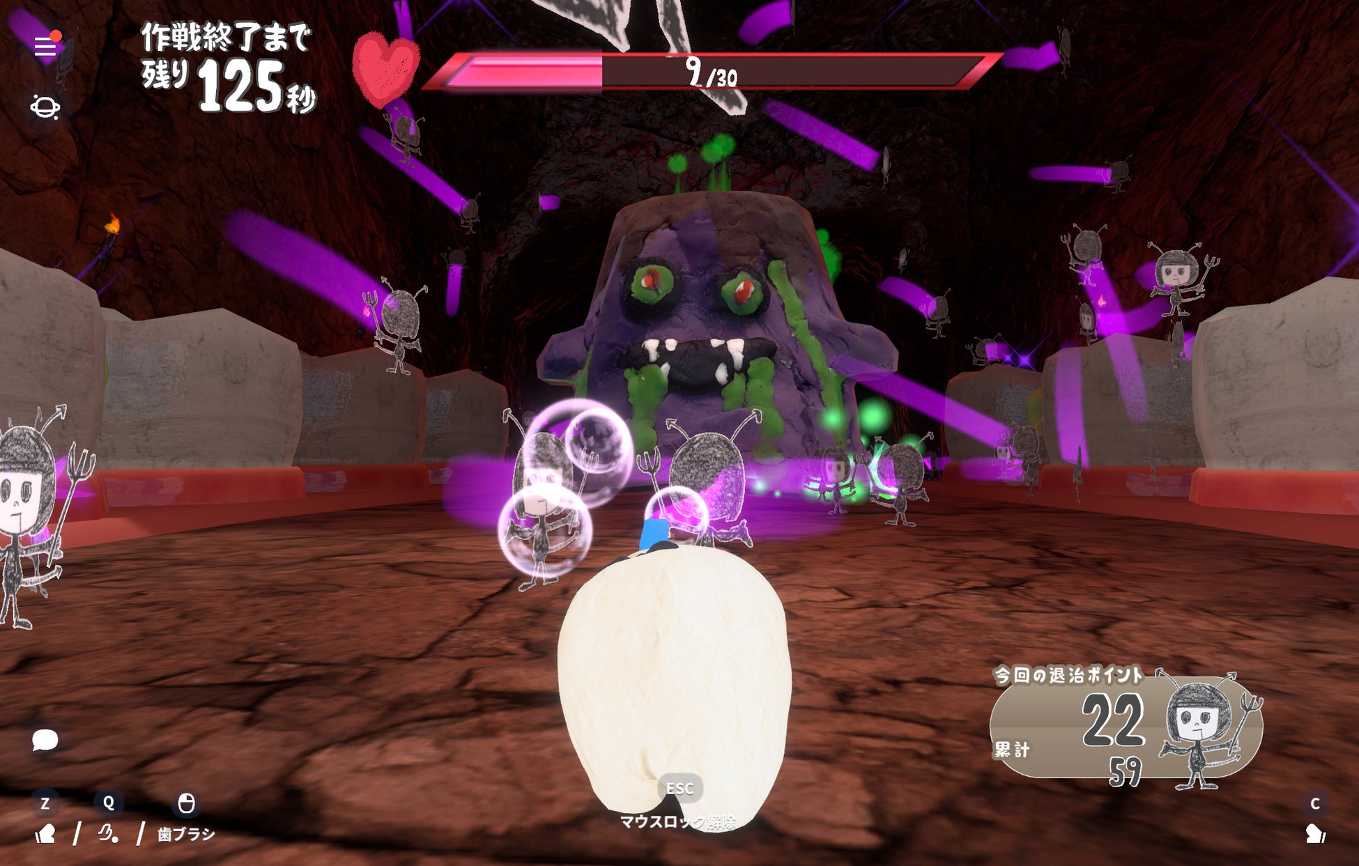 このゲームは、プレイヤーがあのちゃん作のキャラクター「歯周病ちゃんアバター」になって、増殖する「あのバイキン」をかわしながら歯垢が溜まっていく井口さんの歯をキレイにするというゲームです。どんどんでてくる「あのバイキン」を、武器(歯ブラシ)でやっつけて、制限時間300秒を生き残ることができれば勝利です。ボスキャラの「プドロキンいぐいぐ大王」も登場!スマホやPC、VRといった好きなデバイスから誰でも無料でどこからでも遊べるので、ぜひみんなでわいわい集まって楽しんでくださいね!(※画像は開発中のもののため変更の可能性がございます。)
