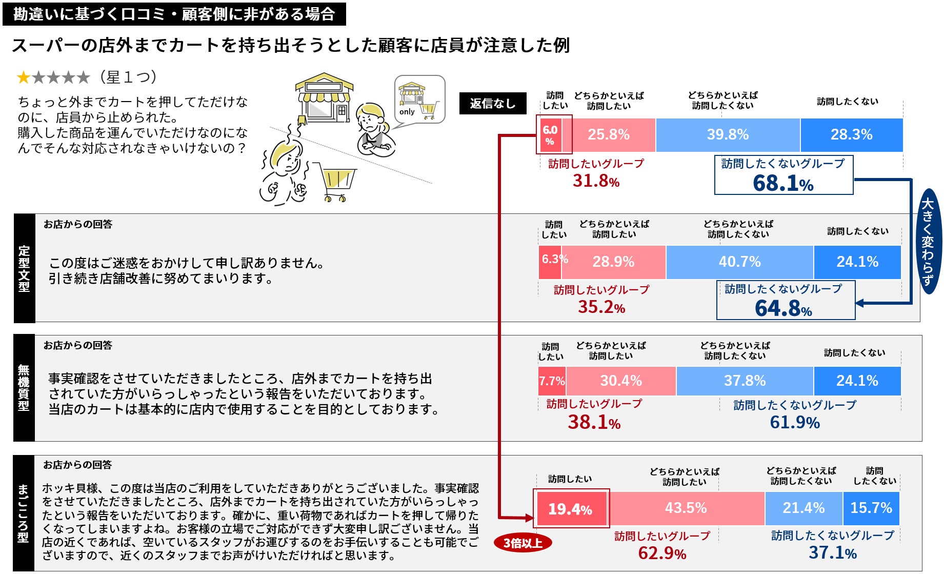 一方で、「まごころ型」では誤解を解きながら丁寧な対応をしており、「返信なし型」では6.0%にとどまった「訪問したい」が、「まごころ型」では19.4%と3倍以上に増えています。