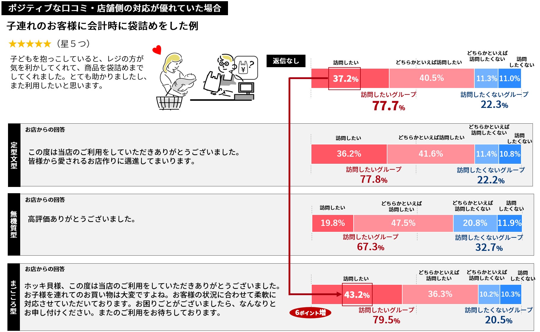 また、「まごころ型」は、「訪問したい」(43.2%)と感じる人が返信なしの場合とくらべて6ポイント増加しています。このため、ポジティブな口コミにも丁寧に返信することで、より店舗への訪問意欲をを促進できるといえます。