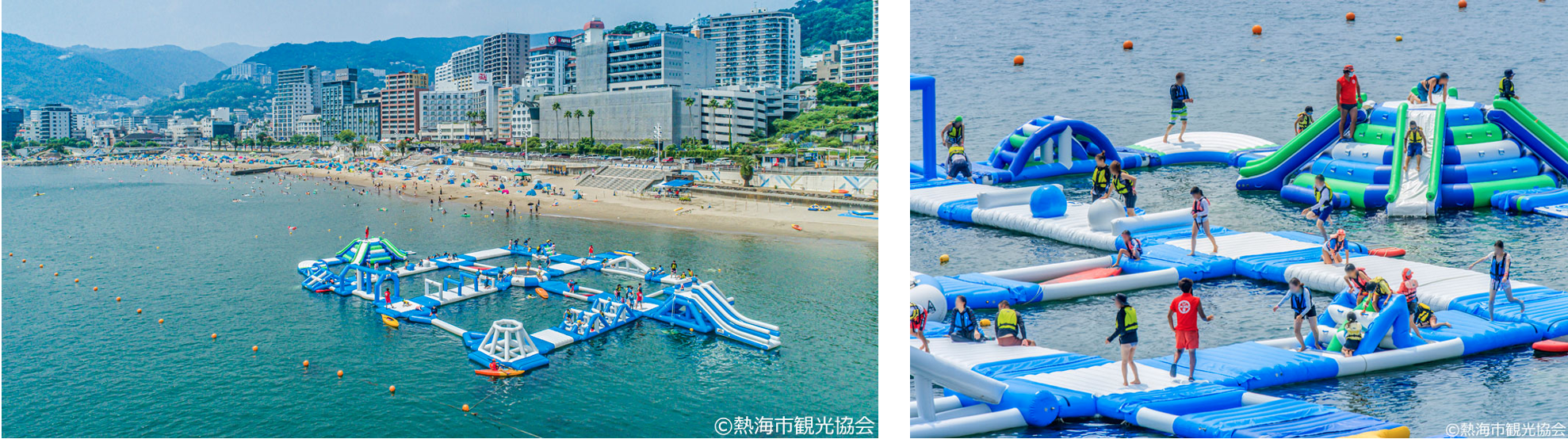 海上に巨大アスレチックが登場する<熱海サンビーチ>に程近い「ホテル水葉亭」と「あたみ」、