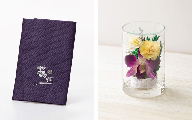 でんぽっぽ、お悔みを伝え偲ぶ心をご進物として届け「使い続ける」弔電2種発売 ~仏花としてお供えできるドライフラワーと慶弔時に利用できる紫のふくさ