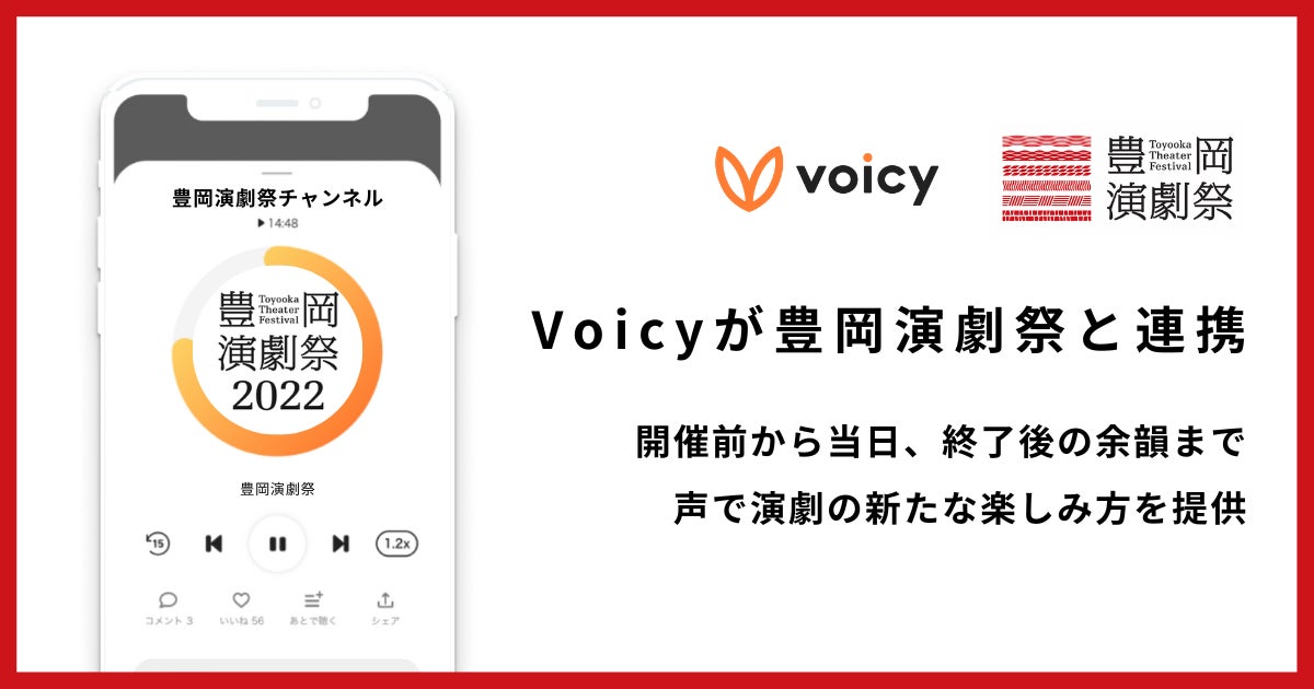株式会社Voicyは豊岡演劇祭実行委員会と連携し、兵庫県豊岡市などで2022年9月15日(木)〜25日(日)に開催される「豊岡演劇祭2022」にて、音声放送を導入します。音声プラットフォームVoicyでチャンネルを開設、演劇祭を声で楽しむという選択肢を増やし、地方創生の音声DXに取り組みます。