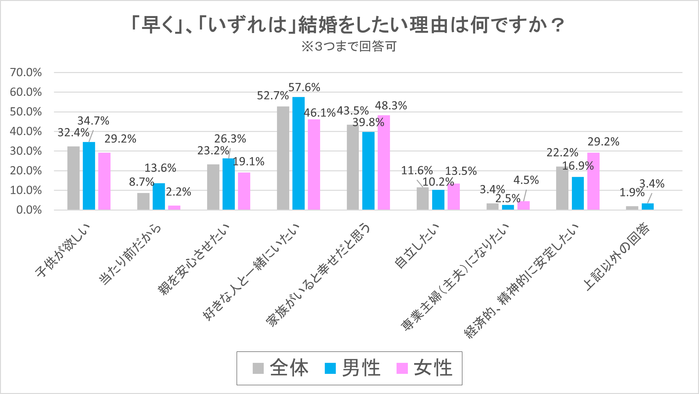 前の設問への回答で、「早く結婚したいと思う」「いずれは結婚したい」を選択した男女に、その理由に該当する選択肢を3つまで選択可として質問しました。