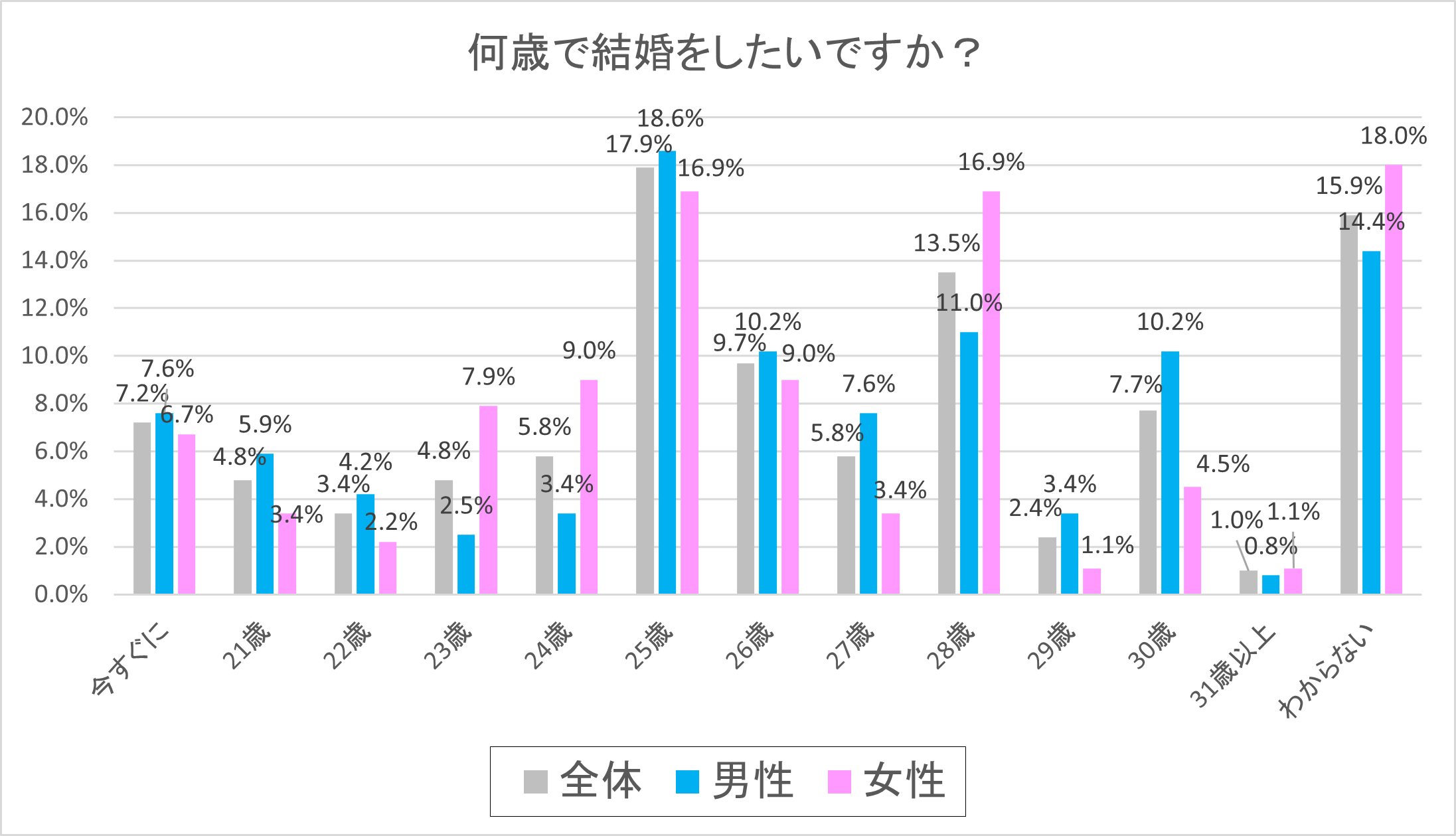 続いて具体的に希望年齢を回答した結果は以下となります。まず最も多かった年齢は「25歳」で、全体で17.9%(男性18.6%、女性:16.9%)となりました。続いて多かった年齢は「28歳」で、全体で13.5%(男性:11.0%、女性16.9%)という結果となりました。3番目に多かった年齢は、「26歳」で、全体で9.7%(男性:10.2%、女性:9.0%)となりました。4番目は「30歳」で全体7.7%(男性:10.2%、女性4.5%)、そして5番目は「今すぐに」という選択肢で、全体で7.2%(男性:7.6%、女性:6.7%)で、以下は「27歳」と「24歳」が同率で5.8%、あとは上記以外の年齢に分散する結果となりました。