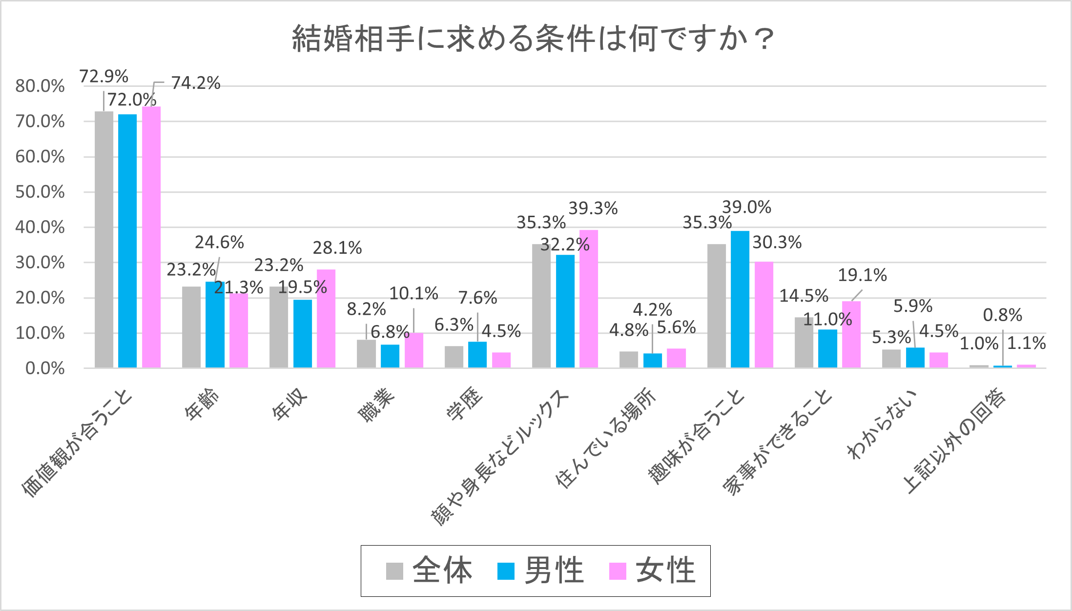 男性72.0%、女性74.2%で、男女ともに7割を超える高い割合となりました。2番目に多かった回答は「趣味が合うこと」と「顔や身長などルックス」の2つの選択肢が同じ割合となり全体で35.3%という結果となりました。男女別では「趣味が合うこと」において、男性39.0%、女性が30.3%となり、「顔や身長などルックス」は、男性が32.2%、女性が39.3%と男女間で差異がみられる結果となりました。4番目は「年収」と「年齢」の2つの選択肢が同じ数値となり全体23.2%という結果で、男女別では「年収」においては男性19.5%、女性28.1%となり、「年齢」においては男性24.6%、女性21.3%という結果となりました。6番目以降は、「家事ができること」(14.5%)、「職業」(8.2%)、「学歴」(6.3%)、「住んでいる場所」(4.8%)、そして「わからない」(5.3%)、その他(1.0%)と続きました。