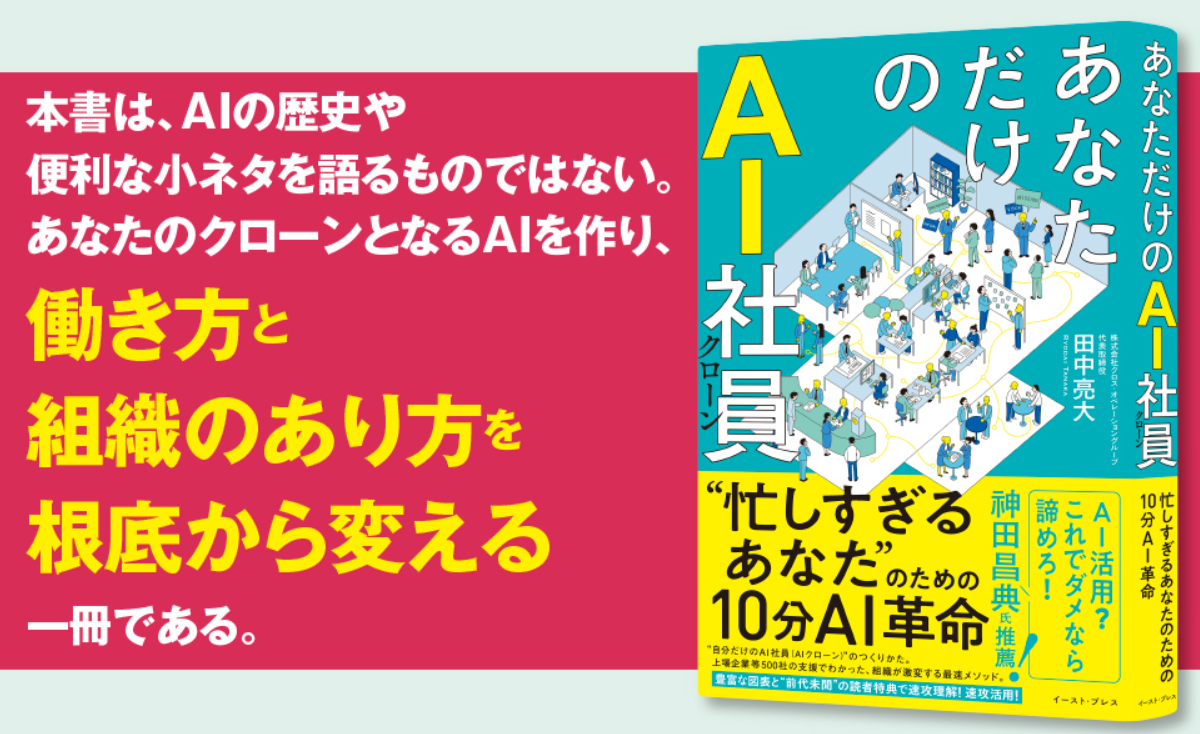 BizOps専門カンパニーとして、先端技術と業務(Ops)の融合に強みを持ち、生成AIを活用した業務改善支援を行う株式会社クロス・オペレーショングループ(東京都千代田区、代表取締役:田中亮大、以下XOP)は、500社以上のAI導入支援で培った知見を詰め込んだ新刊『あなただけのAI社員:忙しすぎるあなたのための10分革命』を2026年1月27日(火)にイースト・プレス社より刊行しました。