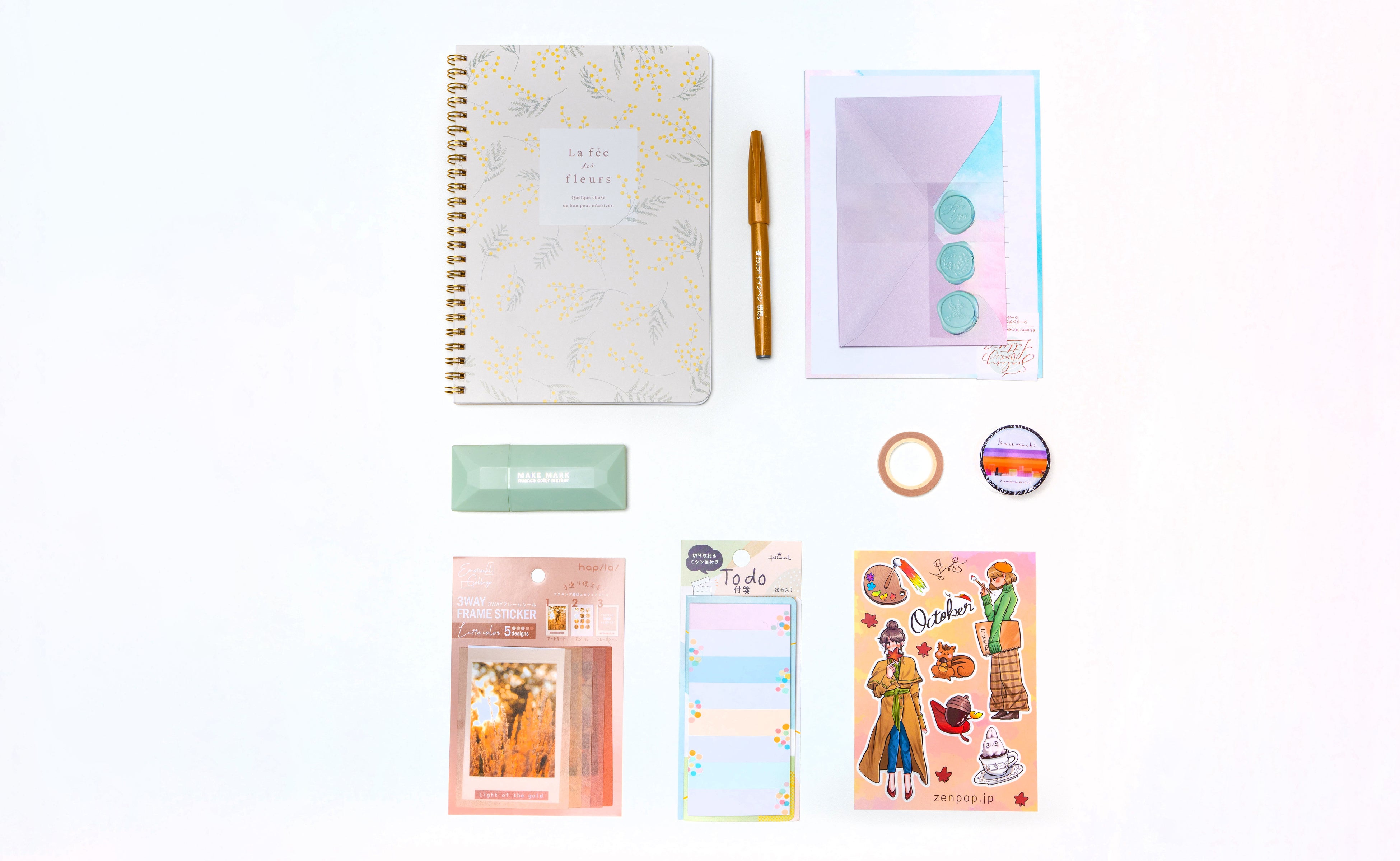 文房具ボックスのテーマは「秋」。ZenPopのお客様層に合わせて、大人かわいい色合いを基調とし、日本の秋をイメージし、表現しています。A5サイズのノートをプランナーブックにアレンジし、付属のシールでデコレーションが楽しめ、自分らしいスケジュールやタスク管理、記録が可能です。各種ペンは快適な書き心地で、アイデアや予定を整理するのに最適です。付箋は、通常の付箋としてはもちろん、プランナーに直接貼り付けてアレンジすることも可能。デザインマスキングテープは、秋の夕暮れを思わせるデザインで、プランナー作成時にも優れた切れ味と使いやすさを提供します。