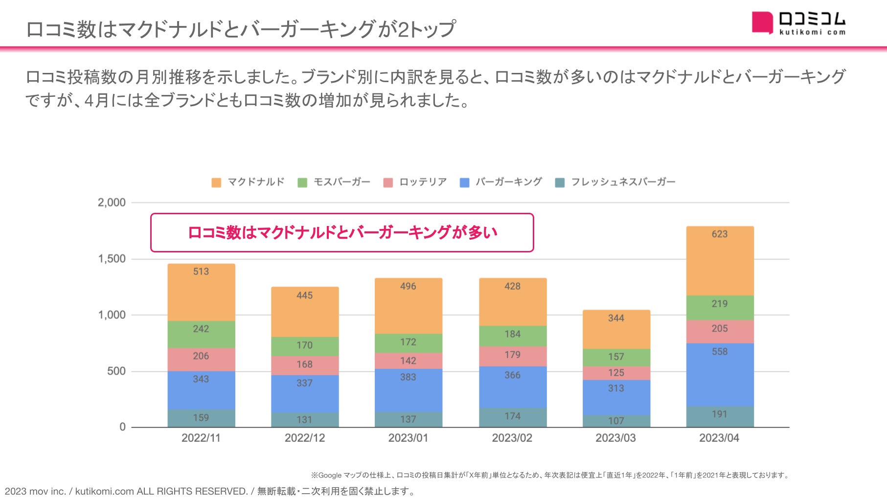 口コミ投稿数の月別推移を示しました。ブランド別に内訳を見ると、口コミ数が多いのはマクドナルドとバーガーキングですが、4月には全ブランドとも口コミ数の増加が見られました。