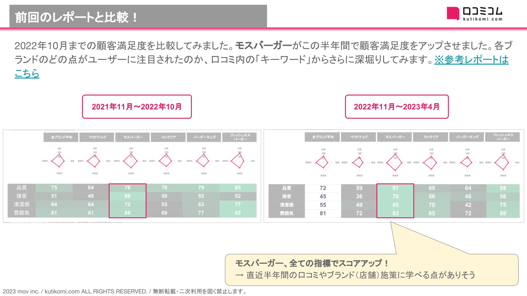 口コミコムの独自AI分析で2022年10月までの顧客満足度と比較してみると、モスバーガーがこの半年間で顧客満足度をアップさせたことが分かりました。