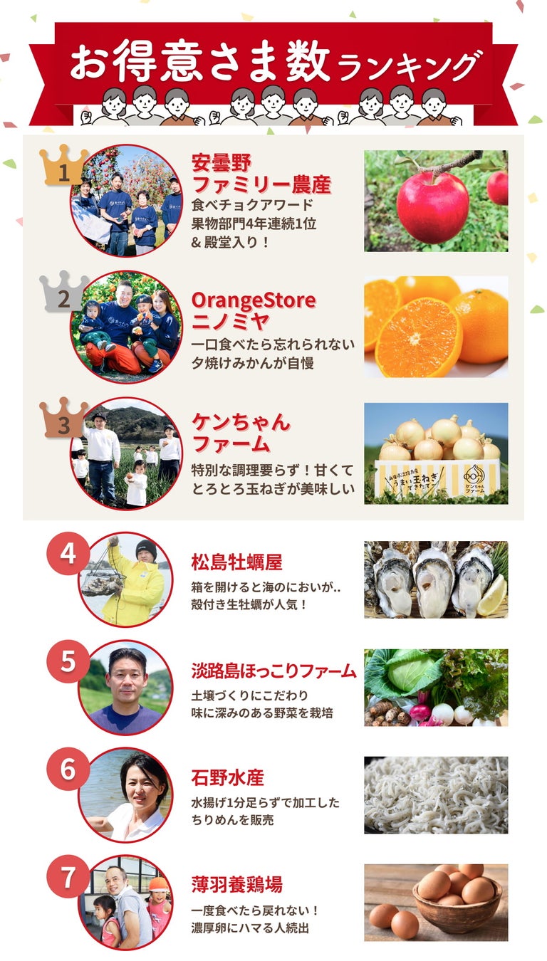 2位には、子供も安心して食べられる柑橘栽培にこだわりを持つOrangeStoreニノミヤさん、3位は食べチョクアワードで野菜部門1位を3年連続で獲得した玉ねぎ生産者ケンちゃんファームさんが入賞しました。