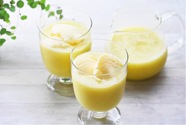 完熟マスクメロンの濃厚ピューレとバニラアイスのコラボで、口の中がとろける至極のスイーツが出来上がります。